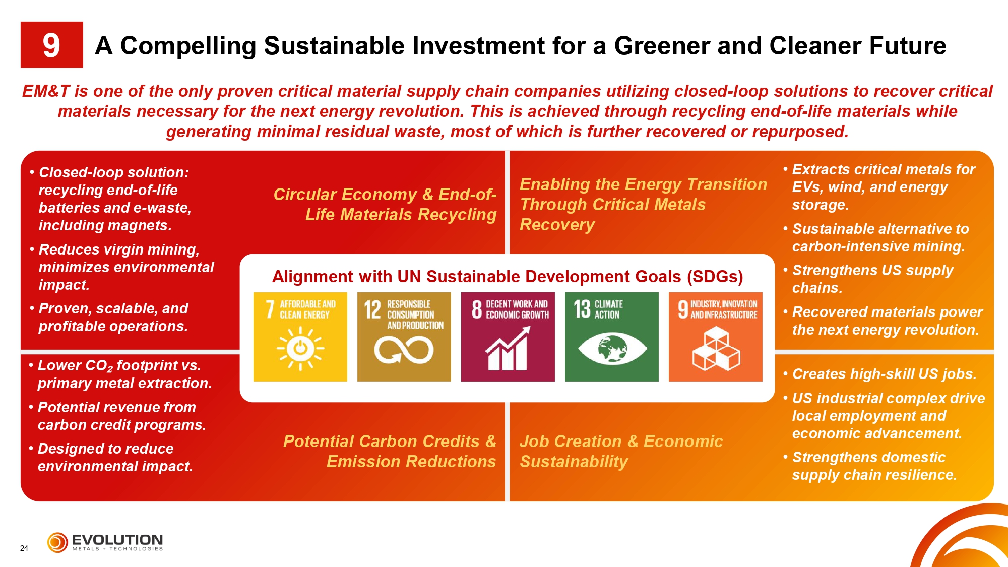 24 A Compelling Sustainable Investment for a Greener and Cleaner Future 9 Circular Economy & End - of - Life Materials Recycling Potential Carbon Credits & Emission Reductions Enabling the Energy Transition Through Critical Metals Recovery Job Creation & Economic Sustainability • Closed - loop solution: recycling end - of - life batteries and e - waste, including magnets. • Reduces virgin mining, minimizes environmental impact. • Proven, scalable, and profitable operations. • Lower CO ₂ footprint vs. primary metal extraction. • Potential revenue from carbon credit programs. • Designed to reduce environmental impact. • Extracts critical metals for EVs, wind, and energy storage. • Sustainable alternative to carbon - intensive mining. • Strengthens US supply chains. • Recovered materials power the next energy revolution. • Creates high - skill US jobs. • US industrial complex drive local employment and economic advancement. • Strengthens domestic supply chain resilience. Alignment with UN Sustainable Development Goals (SDGs) EM&T is one of the only proven critical material supply chain companies utilizing closed - loop solutions to recover critical materials necessary for the next energy revolution. This is achieved through recycling end - of - life materials while generating minimal residual waste, most of which is further recovered or repurposed.