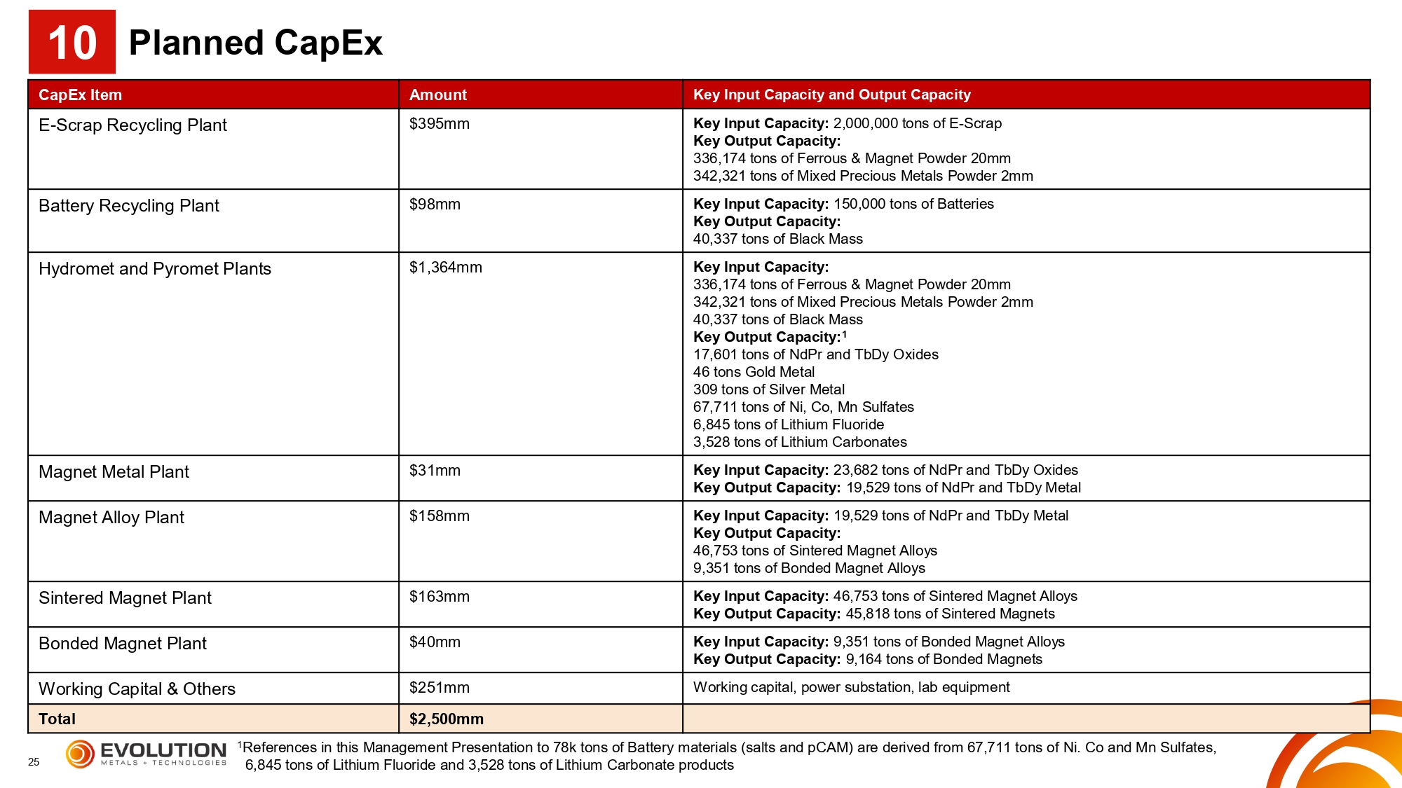 25 Planned CapEx Key Input Capacity and Output Capacity Amount CapEx Item Key Input Capacity: 2,000,000 tons of E - Scrap Key Output Capacity: 336,174 tons of Ferrous & Magnet Powder 20mm 342,321 tons of Mixed Precious Metals Powder 2mm $395mm E - Scrap Recycling Plant Key Input Capacity: 150,000 tons of Batteries Key Output Capacity: 40,337 tons of Black Mass $98mm Battery Recycling Plant Key Input Capacity: 336,174 tons of Ferrous & Magnet Powder 20mm 342,321 tons of Mixed Precious Metals Powder 2mm 40,337 tons of Black Mass Key Output Capacity: 1 17,601 tons of NdPr and TbDy Oxides 46 tons Gold Metal 309 tons of Silver Metal 67,711 tons of Ni, Co, Mn Sulfates 6,845 tons of Lithium Fluoride 3,528 tons of Lithium Carbonates $1,364mm Hydromet and Pyromet Plants Key Input Capacity: 23,682 tons of NdPr and TbDy Oxides Key Output Capacity: 19,529 tons of NdPr and TbDy Metal $31mm Magnet Metal Plant Key Input Capacity: 19,529 tons of NdPr and TbDy Metal Key Output Capacity: 46,753 tons of Sintered Magnet Alloys 9,351 tons of Bonded Magnet Alloys $158mm Magnet Alloy Plant Key Input Capacity: 46,753 tons of Sintered Magnet Alloys Key Output Capacity: 45,818 tons of Sintered Magnets $163mm Sintered Magnet Plant Key Input Capacity: 9,351 tons of Bonded Magnet Alloys Key Output Capacity: 9,164 tons of Bonded Magnets $40mm Bonded Magnet Plant Working capital, power substation, lab equipment $251mm Working Capital & Others $2,500mm Total 10 1 References in this Management Presentation to 78k tons of Battery materials (salts and pCAM) are derived from 67,711 tons of Ni. Co and Mn Sulfates, 6,845 tons of Lithium Fluoride and 3,528 tons of Lithium Carbonate products