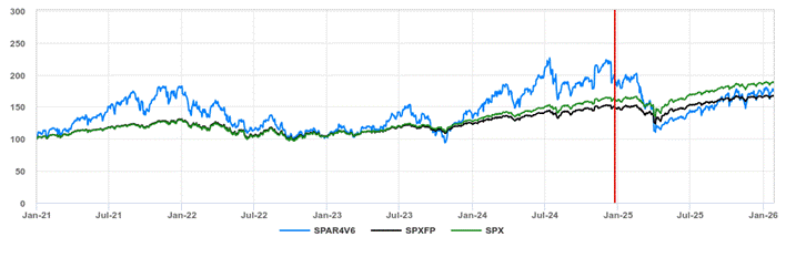 For comparative purposes, the graph below shows the performance, from January 4, 2021 through January 30, 2026, of the S&P 500® Futures 40% VT Adaptive Response 6% Decrement Index (USD) ER, the S&P 500® Futures Excess Return Index and the S&P 500® Index.