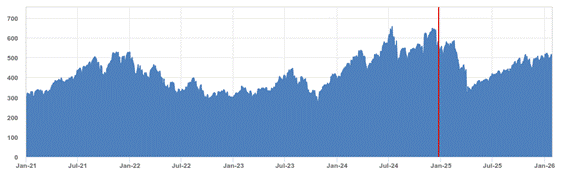 * Historical information begins December 27, 2024 (the index launch date). Hypothetical performance data, which was used for all data prior to December 27, 2024, was obtained from the index sponsor’s website, without independent verification. You should not take the hypothetical performance data or historical performance data as an indication of future performance.