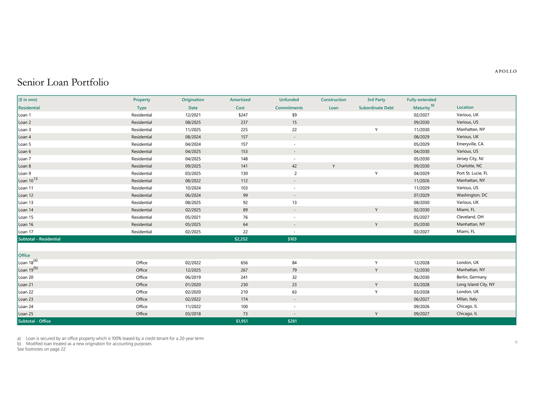 Senior Loan Portfolio ($ in mm) Property Origination Amortized Unfunded Construction 3rd Party Fully-extended 10 Residential Type Date Cost Commitments Loan Subordinate Debt Maturity Location Loan 1 Residential 12/2021 $247 $9 02/2027 Various, UK Loan 2 Residential 08/2025 237 15 09/2030 Various, US Manhattan, NY Loan 3 Residential 11/2025 225 22 Y 11/2030 Various, UK Loan 4 Residential 08/2024 157 - 08/2029 Emeryville, CA Loan 5 Residential 04/2024 157 - 05/2029 Loan 6 Residential 04/2025 153 - 04/2030 Various, US Loan 7 Residential 04/2025 148 - 05/2030 Jersey City, NJ Loan 8 Residential 09/2025 141 42 Y 09/2030 Charlotte, NC Loan 9 Residential 03/2025 130 2 Y 04/2029 Port St. Lucie, FL 13 Manhattan, NY Loan 10 Residential 08/2022 112 - 11/2026 Various, US Loan 11 Residential 10/2024 103 - 11/2029 Loan 12 Residential 06/2024 99 - 07/2029 Washington, DC Loan 13 Residential 08/2025 92 13 08/2030 Various, UK Loan 14 Residential 02/2025 89 - Y 02/2030 Miami, FL Loan 15 Residential 05/2021 76 - 05/2027 Cleveland, OH Manhattan, NY Loan 16 Residential 05/2025 64 - Y 05/2030 Miami, FL Loan 17 Residential 02/2025 22 - 02/2027 Subtotal - Residential $2,252 $103 Office (a) London, UK Loan 18 Office 02/2022 656 84 Y 12/2028 (b) Manhattan, NY Loan 19 Office 12/2025 267 79 Y 12/2030 Loan 20 Office 06/2019 241 32 06/2030 Berlin, Germany Loan 21 Office 01/2020 230 23 Y 03/2028 Long Island City, NY Loan 22 Office 02/2020 210 63 Y 03/2028 London, UK Milan, Italy Loan 23 Office 02/2022 174 - 06/2027 Chicago, IL Loan 24 Office 11/2022 100 - 09/2026 Chicago, IL Loan 25 Office 03/2018 73 - Y 09/2027 Subtotal - Office $1,951 $281 a) Loan is secured by an office property which is 100% leased by a credit tenant for a 20-year term 11 b) Modified loan treated as a new origination for accounting purposes See footnotes on page 22