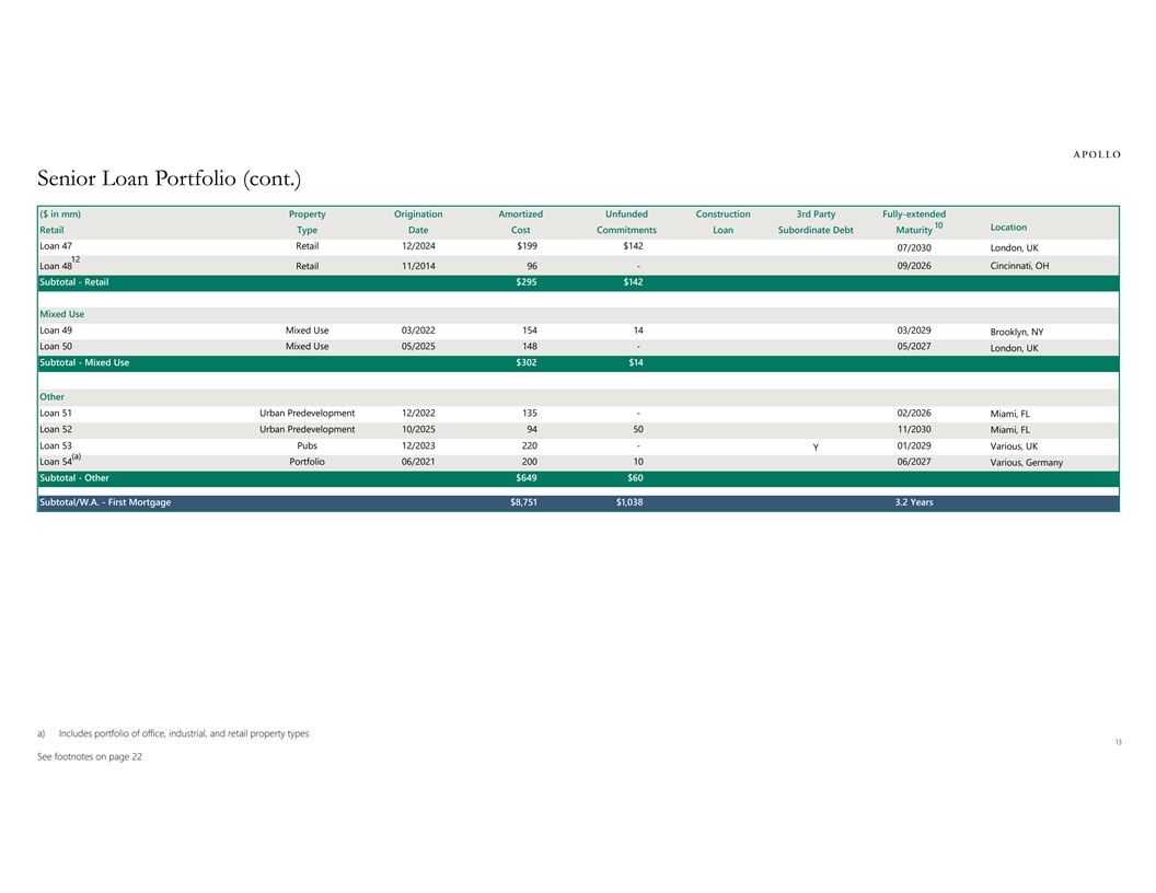 Senior Loan Portfolio (cont.) ($ in mm) Property Origination Amortized Unfunded Construction 3rd Party Fully-extended 10 Location Hotel Type Date Cost Commitments Loan Subordinate Debt Maturity Loan 26 Hotel 12/2023 $340 $15 12/2030 Various, Europe Loan 27 Hotel 10/2025 229 14 Y 10/2028 London, UK Loan 28 Hotel 07/2021 180 - 08/2026 Various, US Loan 29 Hotel 09/2025 149 - 10/2030 Manhattan, NY Loan 30 Hotel 09/2015 139 - 12/2026 Manhattan, NY Loan 31 Hotel 06/2024 131 - 06/2029 St. Petersburg, FL Loan 32 Hotel 08/2025 123 4 Y 09/2030 San Diego, CA Loan 33 Hotel 06/2024 110 5 07/2029 Brooklyn, NY Loan 34 Hotel 11/2021 87 - 12/2026 St. Thomas, USVI Loan 35 Hotel 12/2024 84 2 Y 01/2030 Indianapolis, IN Loan 36 Hotel 12/2025 82 - 04/2027 Manhattan, NY Loan 37 Hotel 12/2024 75 - Y 12/2029 New Orleans, LA 12 Loan 38 Hotel 05/2019 43 - 02/2026 Chicago, IL Subtotal - Hotel $1,772 $40 Industrial Loan 39 Industrial 03/2021 261 - 05/2027 Various, Sweden Loan 40 Industrial 04/2025 244 4 05/2030 Various, US 08/2029 Loan 41 Industrial 08/2024 204 20 Various, UK 12/2030 Loan 42 Industrial 11/2025 181 27 Various, US 08/2030 Loan 43 Industrial 08/2025 80 53 Various, Europe Subtotal - Industrial $970 $104 Data Center 02/2030 Loan 44 Data Center 03/2025 208 91 YY West Jordan, UT 06/2030 Loan 45 Data Center 05/2025 194 203 Y Abilene, TX 02/2029 Loan 46 Data Center 04/2025 158 - Slough, UK Subtotal - Data Center $560 $294 12 See footnotes on page 22
