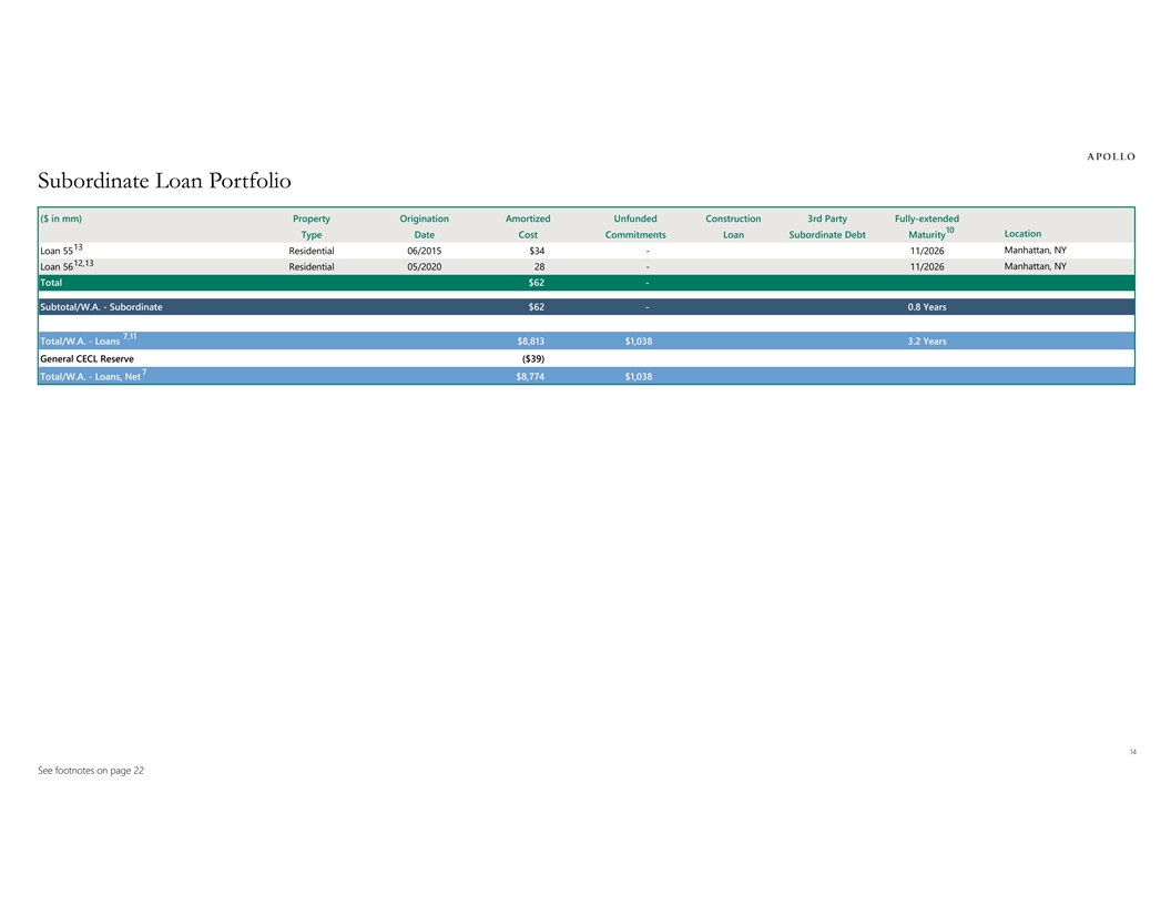 Senior Loan Portfolio (cont.) ($ in mm) Property Origination Amortized Unfunded Construction 3rd Party Fully-extended 10 Location Retail Type Date Cost Commitments Loan Subordinate Debt Maturity Loan 47 Retail 12/2024 $199 $142 07/2030 London, UK 12 Loan 48 Retail 11/2014 96 - 09/2026 Cincinnati, OH Subtotal - Retail $295 $142 Mixed Use Loan 49 Mixed Use 03/2022 154 14 03/2029 Brooklyn, NY Loan 50 Mixed Use 05/2025 148 - 05/2027 London, UK Subtotal - Mixed Use $302 $14 Other Loan 51 Urban Predevelopment 12/2022 135 - 02/2026 Miami, FL Loan 52 Urban Predevelopment 10/2025 94 50 11/2030 Miami, FL Loan 53 Pubs 12/2023 220 - 01/2029 Various, UK Y (a) Loan 54 Portfolio 06/2021 200 10 06/2027 Various, Germany Subtotal - Other $649 $60 Subtotal/W.A. - First Mortgage $8,751 $1,038 3.2 Years a) Includes portfolio of office, industrial, and retail property types 13 See footnotes on page 22