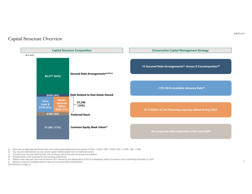 Capital Structure Overview Capital Structure Composition Conservative Capital Management Strategy ($ in mm) (c) (d) 12 Secured Debt Arrangements Across 9 Counterparties (a),(b),(c) Secured Debt Arrangements $6,277 (64%) (f) ~73% W/A Available Advance Rate Debt Related to Real Estate Owned $426 (4%) Senior Term $1,246 Secured Loan B (13%) Notes $746 (8%) $500 (5%) $1.8 billion of net financing capacity added during 2025 $169 (2%) Preferred Stock (e) Common Equity Book Value $1,687 (17%) No corporate debt maturities until June 2029 a) W/A rates of applicable benchmark rates and credit spread adjustments plus spreads of USD: +2.05% / GBP: +1.95% / EUR: +2.26% / SEK: +1.50% b) Our secured credit facilities do not contain capital markets-based mark-to-market provisions c) Consists of ten secured credit facilities, one revolving credit facility and one private securitization d) Includes banks in the syndicate for the revolving credit facility e) Reflects book value per share (net of General CECL Allowance and depreciation) of $12.14 multiplied by shares of common stock outstanding December 31, 2025 15 f) Based on maximum available advance rates across secured debt counterparties See footnotes on page 22