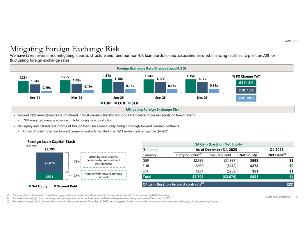 Mitigating Foreign Exchange Risk We have taken several risk mitigating steps to structure and fund our non-US loan portfolio and associated secured financing facilities to position ARI for fluctuating foreign exchange rates Foreign Exchange Rate Change (Local/USD) 1.37x 1.34x 1.35x % FX Change YoY 1.29x 1.25x 1.18x 1.17x 1.17x 1.08x 1.04x GBP: 8% 0.11x 0.11x 0.11x 0.10x 0.10x EUR: 13% Dec-24 Mar-25 Jun-25 Sep-25 Dec-25 SEK: 20% GBP EUR SEK Mitigating Foreign Exchange Risk Ø Secured debt arrangements are structured in local currency thereby reducing FX exposure to our net equity on foreign loans. § 76% weighted average advance on total foreign loan portfolio Ø Net equity and net interest income of foreign loans are economically hedged through forward currency contracts § Forward point impact on forward currency contracts resulted in an $2.1 million realized gain in Q4 2025 Foreign Loan Capital Stack Q4 Gain (Loss) on Net Equity ($ in mm) $3,795 ($ in mm) As of December 31, 2025 Q4 2025 (a) (b) Carrying Value Net Gain Currency Secured Debt Net Equity Offset by local currency denominated secured debt GBP $2,585 ($1,987) $598 $2 76% $2,874 arrangements EUR $950 ($678) $272 $0 SEK $261 ($209) $51 $1 Hedged with forward currency 24% $921 contracts Total $3,795 ($2,874) $921 $4 (c) Q4 gain (loss) on forward contracts ($2) Net Equity Secured Debt a) Carrying value includes all commercial mortgage and subordinate loans denominated in foreign currencies with or without secured debt financing Private and Confidential 16 b) Represents the net gain (loss) on foreign loan principal and respective foreign secured debt arrangements for the quarter ended December 31, 2025. c) Represents net gain (loss) on forward contracts for the quarter ended December 31, 2025, excluding gains (losses) on forward currency contracts economically hedging foreign currency interest