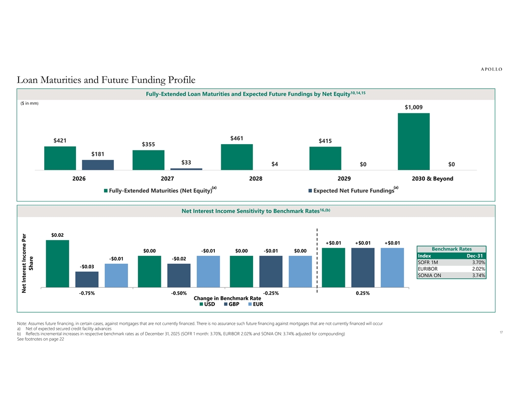 Loan Maturities and Future Funding Profile 10,14,15 Fully-Extended Loan Maturities and Expected Future Fundings by Net Equity ($ in mm) $1,009 $461 $421 $415 $355 $181 $33 $4 $0 $0 2026 2027 2028 2029 2030 & Beyond (a) (a) Fully-Extended Maturities (Net Equity) Expected Net Future Fundings 16,(b) Net Interest Income Sensitivity to Benchmark Rates $0.02 +$0.01 +$0.01 +$0.01 Benchmark Rates $0.00 $0. -$0.0100 -$0.01 $0.00 Index Dec-31 -$0.01 -$0.02 SOFR 1M 3.70% -$0.03 EURIBOR 2.02% SONIA ON 3.74% -0.75% -0.50% -0.25% 0.25% Change in Benchmark Rate USD GBP EUR Note: Assumes future financing, in certain cases, against mortgages that are not currently financed. There is no assurance such future financing against mortgages that are not currently financed will occur a) Net of expected secured credit facility advances 17 b) Reflects incremental increases in respective benchmark rates as of December 31, 2025 (SOFR 1 month: 3.70%, EURIBOR 2.02% and SONIA ON: 3.74% adjusted for compounding) See footnotes on page 22 Net Interest Income Per Share