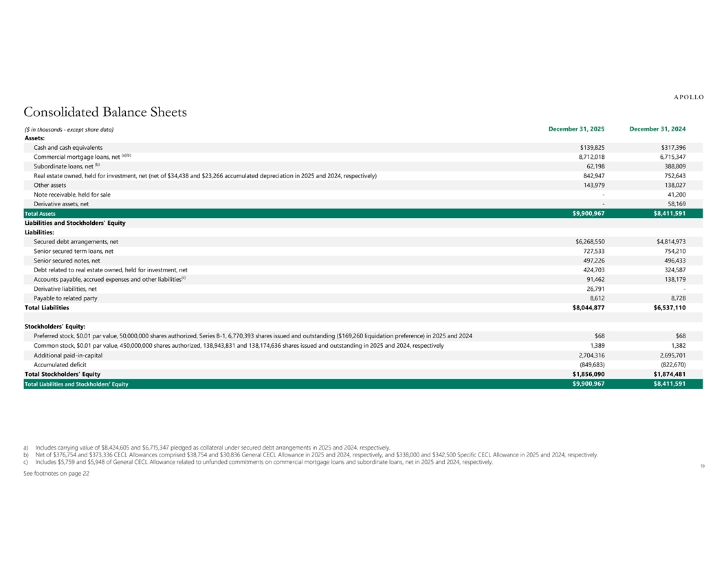 Consolidated Balance Sheets December 31, 2025 December 31, 2024 ($ in thousands - except share data) Assets: Cash and cash equivalents $139,825 $317,396 (a)(b) Commercial mortgage loans, net 8,712,018 6,715,347 (b) Subordinate loans, net 62,198 388,809 Real estate owned, held for investment, net (net of $34,438 and $23,266 accumulated depreciation in 2025 and 2024, respectively) 842,947 752,643 Other assets 143,979 138,027 Note receivable, held for sale - 41,200 Derivative assets, net - 58,169 $9,900,967 $8,411,591 Total Assets Liabilities and Stockholders' Equity Liabilities: Secured debt arrangements, net $6,268,550 $4,814,973 Senior secured term loans, net 727,533 754,210 Senior secured notes, net 497,226 496,433 Debt related to real estate owned, held for investment, net 424,703 324,587 (c) Accounts payable, accrued expenses and other liabilities 91,462 138,179 Derivative liabilities, net 26,791 - Payable to related party 8,612 8,728 Total Liabilities $8,044,877 $6,537,110 Stockholders’ Equity: Preferred stock, $0.01 par value, 50,000,000 shares authorized, Series B-1, 6,770,393 shares issued and outstanding ($169,260 liquidation preference) in 2025 and 2024 $68 $68 Common stock, $0.01 par value, 450,000,000 shares authorized, 138,943,831 and 138,174,636 shares issued and outstanding in 2025 and 2024, respectively 1,389 1,382 Additional paid-in-capital 2,704,316 2,695,701 Accumulated deficit (849,683) (822,670) Total Stockholders’ Equity $1,856,090 $1,874,481 Total Liabilities and Stockholders’ Equity $9,900,967 $8,411,591 a) Includes carrying value of $8,424,605 and $6,715,347 pledged as collateral under secured debt arrangements in 2025 and 2024, respectively. b) Net of $376,754 and $373,336 CECL Allowances comprised $38,754 and $30,836 General CECL Allowance in 2025 and 2024, respectively, and $338,000 and $342,500 Specific CECL Allowance in 2025 and 2024, respectively. c) Includes $5,759 and $5,948 of General CECL Allowance related to unfunded commitments on commercial mortgage loans and subordinate loans, net in 2025 and 2024, respectively. 19 See footnotes on page 22