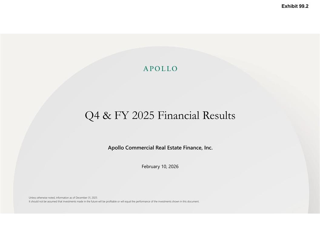 Exhibit 99.2 Q4 & FY 2025 Financial Results Apollo Commercial Real Estate Finance, Inc. February 10, 2026 Unless otherwise noted, information as of December 31, 2025 It should not be assumed that investments made in the future will be profitable or will equal the performance of the investments shown in this document.