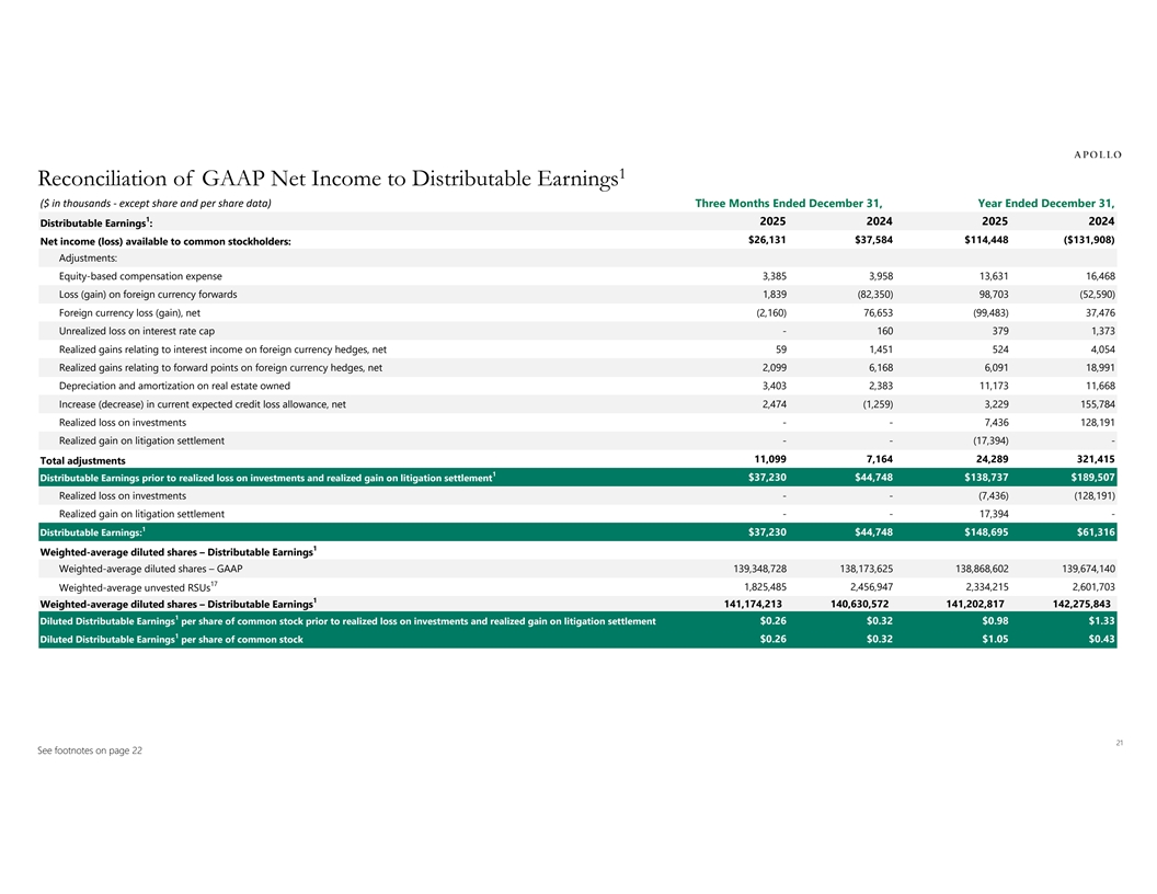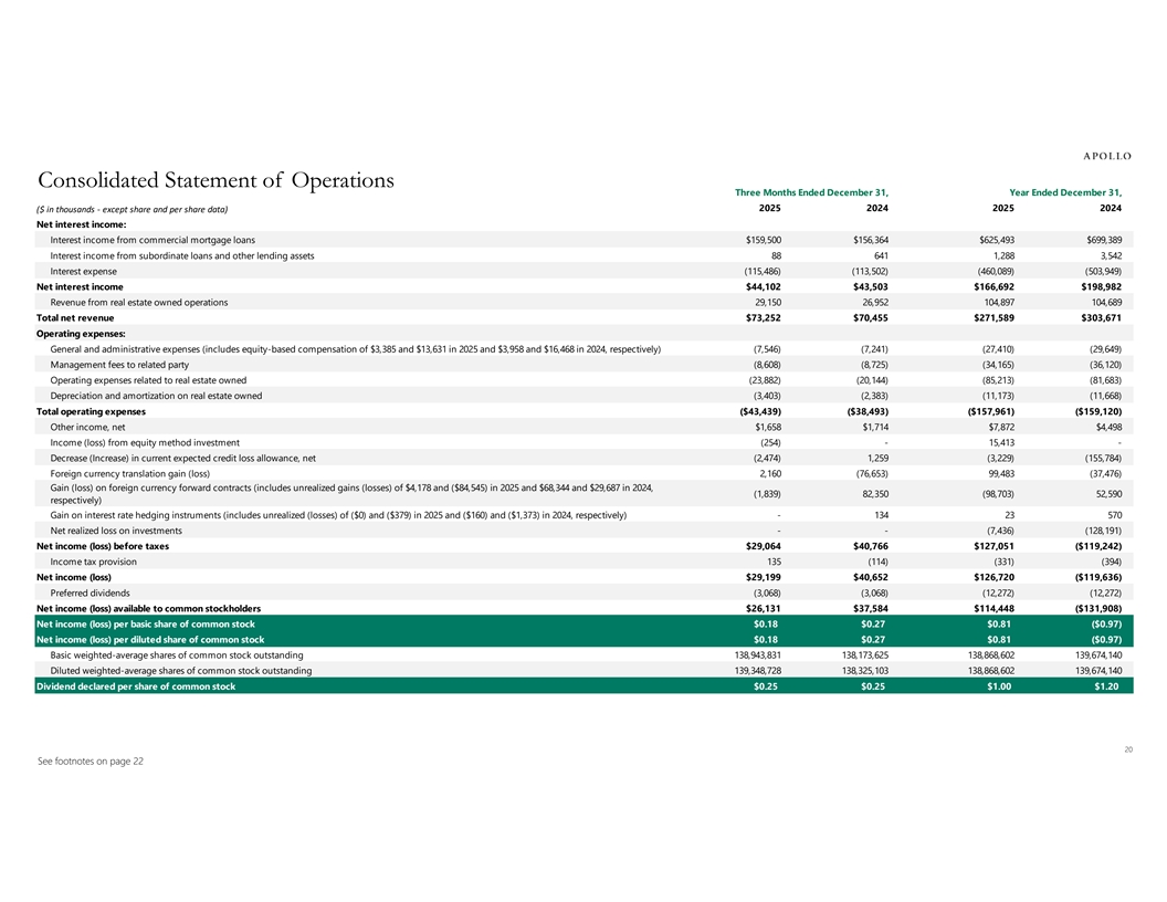 Consolidated Statement of Operations Three Months Ended December 31, Year Ended December 31, ($ in thousands - except share and per share data) 2025 2024 2025 2024 Net interest income: Interest income from commercial mortgage loans $159,500 $156,364 $625,493 $699,389 Interest income from subordinate loans and other lending assets 88 641 1,288 3,542 Interest expense (115,486) (113,502) (460,089) (503,949) Net interest income $44,102 $43,503 $166,692 $198,982 Revenue from real estate owned operations 29,150 26,952 104,897 104,689 Total net revenue $73,252 $70,455 $271,589 $303,671 Operating expenses: General and administrative expenses (includes equity-based compensation of $3,385 and $13,631 in 2025 and $3,958 and $16,468 in 2024, respectively) (7,546) (7,241) (27,410) (29,649) Management fees to related party (8,608) (8,725) (34,165) (36,120) Operating expenses related to real estate owned (23,882) (20,144) (85,213) (81,683) Depreciation and amortization on real estate owned (3,403) (2,383) (11,173) (11,668) Total operating expenses ($43,439) ($38,493) ($157,961) ($159,120) Other income, net $1,658 $1,714 $7,872 $4,498 Income (loss) from equity method investment (254) - 15,413 - Decrease (Increase) in current expected credit loss allowance, net (2,474) 1,259 (3,229) (155,784) Foreign currency translation gain (loss) 2,160 (76,653) 99,483 (37,476) Gain (loss) on foreign currency forward contracts (includes unrealized gains (losses) of $4,178 and ($84,545) in 2025 and $68,344 and $29,687 in 2024, (1,839) 82,350 (98,703) 52,590 respectively) Gain on interest rate hedging instruments (includes unrealized (losses) of ($0) and ($379) in 2025 and ($160) and ($1,373) in 2024, respectively) - 134 23 570 Net realized loss on investments - - (7,436) (128,191) Net income (loss) before taxes $29,064 $40,766 $127,051 ($119,242) Income tax provision 135 (114) (331) (394) Net income (loss) $29,199 $40,652 $126,720 ($119,636) Preferred dividends (3,068) (3,068) (12,272) (12,272) Net income (loss) available to common stockholders $26,131 $37,584 $114,448 ($131,908) Net income (loss) per basic share of common stock $0.18 $0.27 $0.81 ($0.97) Net income (loss) per diluted share of common stock $0.18 $0.27 $0.81 ($0.97) Basic weighted-average shares of common stock outstanding 138,943,831 138,173,625 138,868,602 139,674,140 Diluted weighted-average shares of common stock outstanding 139,348,728 138,325,103 138,868,602 139,674,140 Dividend declared per share of common stock $0.25 $0.25 $1.00 $1.20 20 See footnotes on page 22