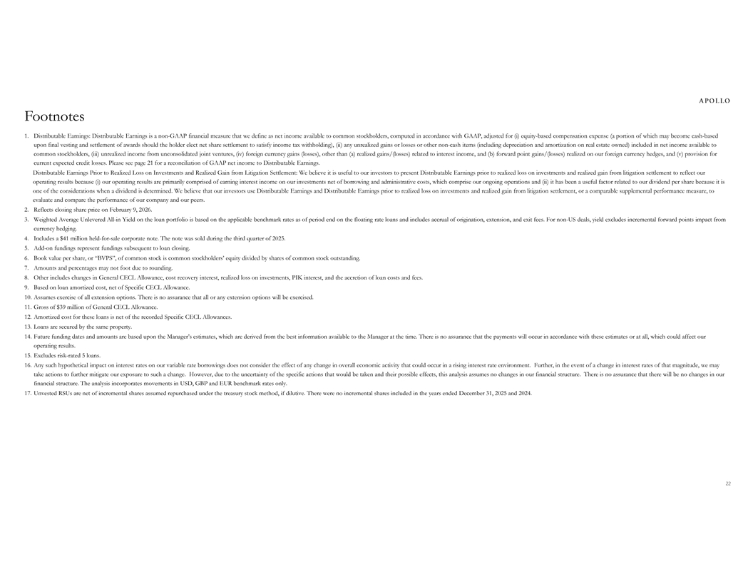 Footnotes 1. Distributable Earnings: Distributable Earnings is a non-GAAP financial measure that we define as net income available to common stockholders, computed in accordance with GAAP, adjusted for (i) equity-based compensation expense (a portion of which may become cash-based upon final vesting and settlement of awards should the holder elect net share settlement to satisfy income tax withholding), (ii) any unrealized gains or losses or other non-cash items (including depreciation and amortization on real estate owned) included in net income available to common stockholders, (iii) unrealized income from unconsolidated joint ventures, (iv) foreign currency gains (losses), other than (a) realized gains/(losses) related to interest income, and (b) forward point gains/(losses) realized on our foreign currency hedges, and (v) provision for current expected credit losses. Please see page 21 for a reconciliation of GAAP net income to Distributable Earnings. Distributable Earnings Prior to Realized Loss on Investments and Realized Gain from Litigation Settlement: We believe it is useful to our investors to present Distributable Earnings prior to realized loss on investments and realized gain from litigation settlement to reflect our operating results because (i) our operating results are primarily comprised of earning interest income on our investments net of borrowing and administrative costs, which comprise our ongoing operations and (ii) it has been a useful factor related to our dividend per share because it is one of the considerations when a dividend is determined. We believe that our investors use Distributable Earnings and Distributable Earnings prior to realized loss on investments and realized gain from litigation settlement, or a comparable supplemental performance measure, to evaluate and compare the performance of our company and our peers. 2. Reflects closing share price on February 9, 2026. 3. Weighted Average Unlevered All-in Yield on the loan portfolio is based on the applicable benchmark rates as of period end on the floating rate loans and includes accrual of origination, extension, and exit fees. For non-US deals, yield excludes incremental forward points impact from currency hedging. 4. Includes a $41 million held-for-sale corporate note. The note was sold during the third quarter of 2025. 5. Add-on fundings represent fundings subsequent to loan closing. 6. Book value per share, or “BVPS”, of common stock is common stockholders’ equity divided by shares of common stock outstanding. 7. Amounts and percentages may not foot due to rounding. 8. Other includes changes in General CECL Allowance, cost recovery interest, realized loss on investments, PIK interest, and the accretion of loan costs and fees. 9. Based on loan amortized cost, net of Specific CECL Allowance. 10. Assumes exercise of all extension options. There is no assurance that all or any extension options will be exercised. 11. Gross of $39 million of General CECL Allowance. 12. Amortized cost for these loans is net of the recorded Specific CECL Allowances. 13. Loans are secured by the same property. 14. Future funding dates and amounts are based upon the Manager’s estimates, which are derived from the best information available to the Manager at the time. There is no assurance that the payments will occur in accordance with these estimates or at all, which could affect our operating results. 15. Excludes risk-rated 5 loans. 16. Any such hypothetical impact on interest rates on our variable rate borrowings does not consider the effect of any change in overall economic activity that could occur in a rising interest rate environment. Further, in the event of a change in interest rates of that magnitude, we may take actions to further mitigate our exposure to such a change. However, due to the uncertainty of the specific actions that would be taken and their possible effects, this analysis assumes no changes in our financial structure. There is no assurance that there will be no changes in our financial structure. The analysis incorporates movements in USD, GBP and EUR benchmark rates only. 17. Unvested RSUs are net of incremental shares assumed repurchased under the treasury stock method, if dilutive. There were no incremental shares included in the years ended December 31, 2025 and 2024. 22