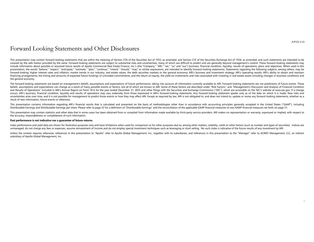 Forward Looking Statements and Other Disclosures This presentation may contain forward-looking statements that are within the meaning of Section 27A of the Securities Act of 1933, as amended, and Section 21E of the Securities Exchange Act of 1934, as amended, and such statements are intended to be covered by the safe harbor provided by the same. Forward-looking statements are subject to substantial risks and uncertainties, many of which are difficult to predict and are generally beyond management’s control. These forward-looking statements may include information about possible or assumed future results of Apollo Commercial Real Estate Finance, Inc.’s (the “Company,” “ARI,” “we,” “us” and “our”) business, financial condition, liquidity, results of operations, plans and objectives. When used in this presentation, the words “believe,” “expect,” “anticipate,” “estimate,” “plan,” “continue,” “intend,” “should,” “may” or similar expressions, are intended to identify forward-looking statements. Statements regarding the following subjects, among others, may be forward-looking: higher interest rates and inflation; market trends in our industry, real estate values, the debt securities markets or the general economy; ARI’s business and investment strategy; ARI’s operating results; ARI’s ability to obtain and maintain financing arrangements; the timing and amounts of expected future fundings of unfunded commitments; and the return on equity, the yield on investments and risks associated with investing in real estate assets including changes in business conditions and the general economy. The forward-looking statements are based on management’s beliefs, assumptions and expectations of future performance, taking into account all information currently available to ARI. Forward-looking statements are not predictions of future events. These beliefs, assumptions and expectations can change as a result of many possible events or factors, not all of which are known to ARI. Some of these factors are described under “Risk Factors,” and “Management’s Discussion and Analysis of Financial Condition and Results of Operations” included in ARI’s Annual Report on Form 10-K for the year ended December 31, 2025 and other filings with the Securities and Exchange Commission (“SEC”), which are accessible on the SEC’s website at www.sec.gov. If a change occurs, ARI’s business, financial condition, liquidity and results of operations may vary materially from those expressed in ARI’s forward-looking statements. Any forward-looking statement speaks only as of the date on which it is made. New risks and uncertainties arise over time, and it is not possible for management to predict those events or how they may affect ARI. Except as required by law, ARI is not obligated to, and does not intend to, update or revise any forward-looking statements, whether as a result of new information, future events or otherwise. This presentation contains information regarding ARI’sfinancial resultsthatiscalculated and presented on the basis of methodologies other than in accordance with accounting principles generally accepted in the United States (“GAAP”), including Distributable Earnings and Distributable Earnings per share. Please refer to page 22 for a definition of “Distributable Earnings” and the reconciliation of the applicable GAAP financial measures to non-GAAP financial measures set forth on page 21. This presentation may contain statistics and other data that in some cases has been obtained from or compiled from information made available by third-party service providers. ARI makes no representation or warranty, expressed or implied, with respect to the accuracy, reasonableness or completeness of such information. Past performance is not indicative nor a guarantee of future returns. Index performance and yield data are shown for illustrative purposes only and have limitations when used for comparison or for other purposes due to, among other matters, volatility, credit or other factors (such as number and types of securities). Indices are unmanaged, do not charge any fees or expenses, assume reinvestment of income and do not employ special investment techniques such as leveraging or short selling. No such index is indicative of the future results of any investment by ARI. Unless the context requires otherwise, references in this presentation to “Apollo” refer to Apollo Global Management, Inc., together with its subsidiaries, and references in this presentation to the “Manager” refer to ACREFI Management, LLC, an indirect subsidiary of Apollo Global Management, Inc. 2
