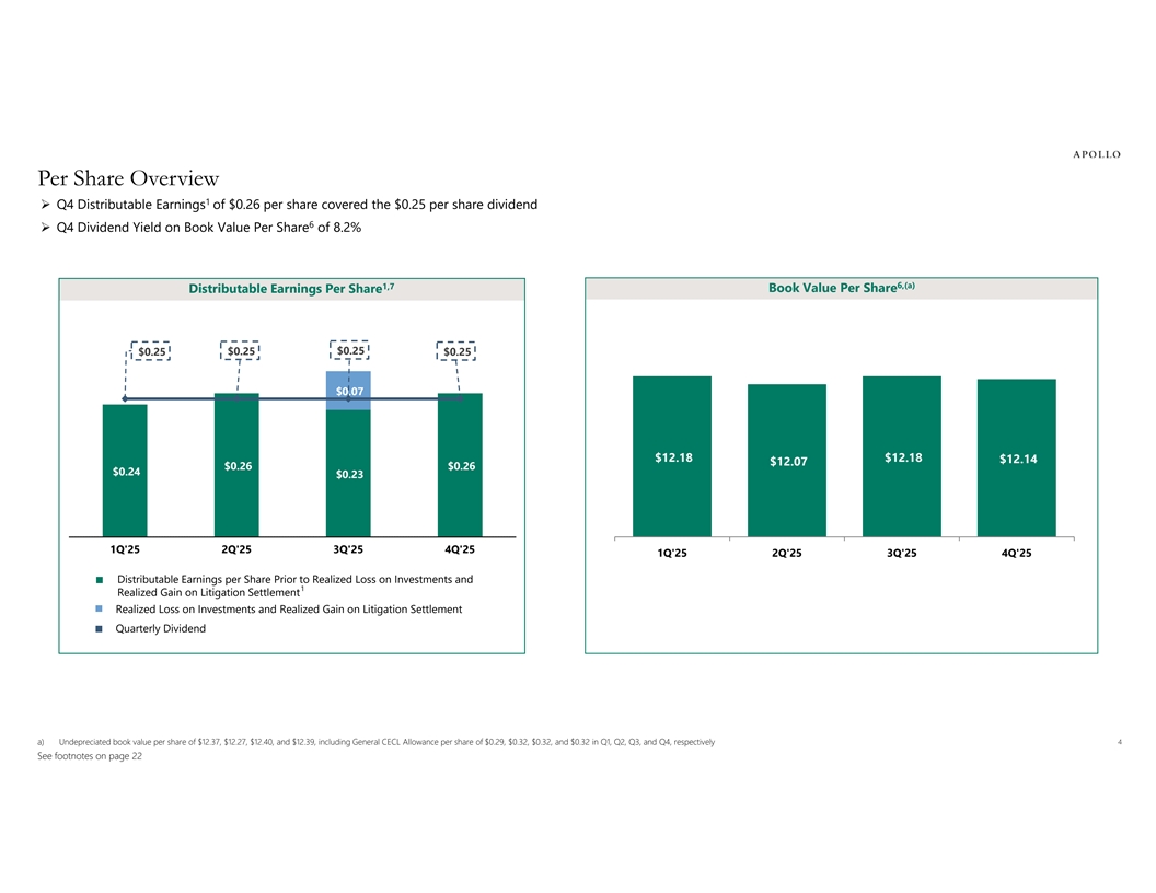 Per Share Overview 1 Ø Q4 Distributable Earnings of $0.26 per share covered the $0.25 per share dividend 6 Ø Q4 Dividend Yield on Book Value Per Share of 8.2% 1,7 6,(a) Book Value Per Share Distributable Earnings Per Share $0.25 $0.25 $0.25 $0.25 $0.07 $12.18 $12.18 $12.14 $12.07 $0.26 $0.26 $0.24 $0.23 1Q'25 2Q'25 3Q'25 4Q'25 1Q'25 2Q'25 3Q'25 4Q'25 Distributable Earnings per Share Prior to Realized Loss on Investments and § 1 Realized Gain on Litigation Settlement Realized Loss on Investments and Realized Gain on Litigation Settlement § Quarterly Dividend § 4 a) Undepreciated book value per share of $12.37, $12.27, $12.40, and $12.39, including General CECL Allowance per share of $0.29, $0.32, $0.32, and $0.32 in Q1, Q2, Q3, and Q4, respectively See footnotes on page 22