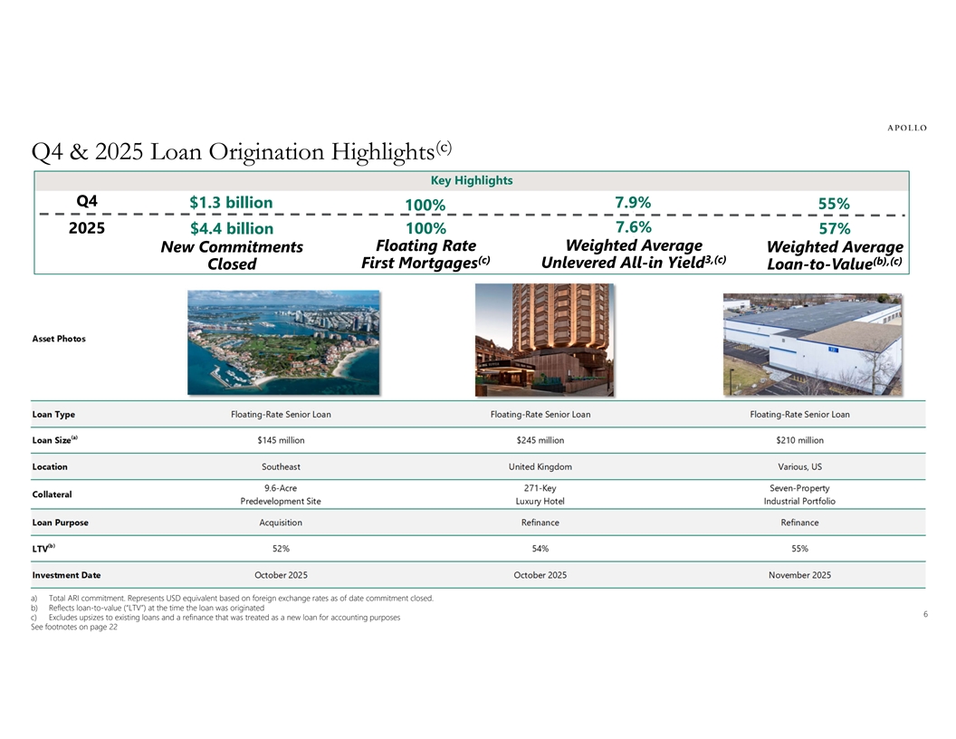 Portfolio Activity & REO Overview Q4 Portfolio Activity 2025 Portfolio Activity ($ in mm) 5 Add-on Add-on Funding ($2,909) 5 Funding $899 $198 ($852) $12 $366 ($3) ($1) ($29) $5 $1,113 $3,297 New Funding New Funding $8,774 $8,774 $8,774 $8,774 $8,304 $7,145 4 8 7 7 8 4Q24 Fundings Repayments Specific CECL FX Other 4Q25 3Q25 Fundings Repayments Specific CECL FX Other 4Q25 th th Update on Update on 111 111 West West 57 57 Street Street REO Overview REO Overview & & Update Update Ø Six contracts closed during Q4 generating ~$109 Ø Brooklyn Multifamily: 591-unit, 53-story multifamily tower million of net sales proceeds Ø 56% of Market Units leased Ø One unit under contract for estimated net sales proceeds of ~$17 million Ø Move-ins commenced in July and strong leasing momentum continues Ø All net sales proceeds continue to pay down ARI’s loans ($ in mm) Net Net (a) 7 As of December 31, 2025 Assets Debt Equity Brooklyn Multifamily $638 ($351) $287 D.C. Hotel 158 (73) 85 Atlanta Hotel 69 - 69 7 Total REO Held for Investment $865 ($424) $441 a) Debt related to real estate owned represents construction financing on our Brooklyn Multifamily property (maximum commitment of $388 million and presented net of $1 million in deferred financing costs) and mortgage on our D.C. Hotel (maximum commitment 5 of $74 million and presented net of $1 million in deferred financing costs) See footnotes on page 22