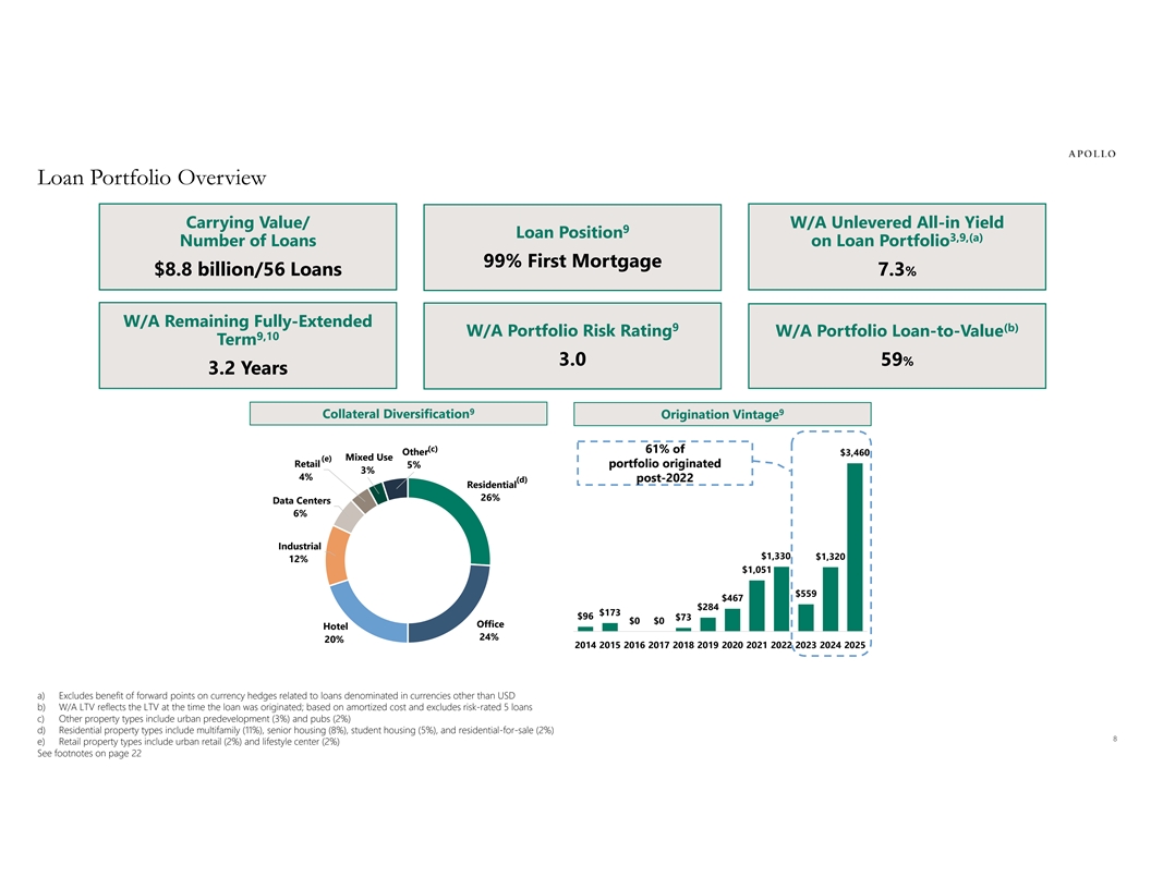 (c) Q4 & 2025 Loan Origination Highlights (cont.) a) Total ARI commitment. Represents USD equivalent based on foreign exchange rates as of date commitment closed. b) Reflects LTV at the time the loan was originated 7 c) Excludes upsizes to existing loans and a refinance that was treated as a new loan for accounting purposes See footnotes on page 22