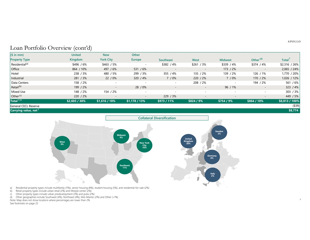 Loan Portfolio Overview Carrying Value/ W/A Unlevered All-in Yield 9 Loan Position 3,9,(a) Number of Loans on Loan Portfolio 99% First Mortgage $8.8 billion/56 Loans 7.3% W/A Remaining Fully-Extended 9 (b) W/A Portfolio Risk Rating W/A Portfolio Loan-to-Value 9,10 Term 3.0 59% 3.2 Years 9 9 Collateral Diversification Origination Vintage (c) 61% of Other $3,460 Mixed Use (e) Retail 5% portfolio originated 3% 4% (d) post-2022 Residential 26% Data Centers 6% Industrial $1,330 $1,320 12% $1,051 $559 $467 $284 $173 $96 $73 $0 $0 Office Hotel 24% 20% 2014 2015 2016 2017 2018 2019 2020 2021 2022 2023 2024 2025 a) Excludes benefit of forward points on currency hedges related to loans denominated in currencies other than USD b) W/A LTV reflects the LTV at the time the loan was originated; based on amortized cost and excludes risk-rated 5 loans c) Other property types include urban predevelopment (3%) and pubs (2%) d) Residential property types include multifamily (11%), senior housing (8%), student housing (5%), and residential-for-sale (2%) 8 e) Retail property types include urban retail (2%) and lifestyle center (2%) See footnotes on page 22
