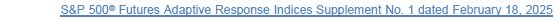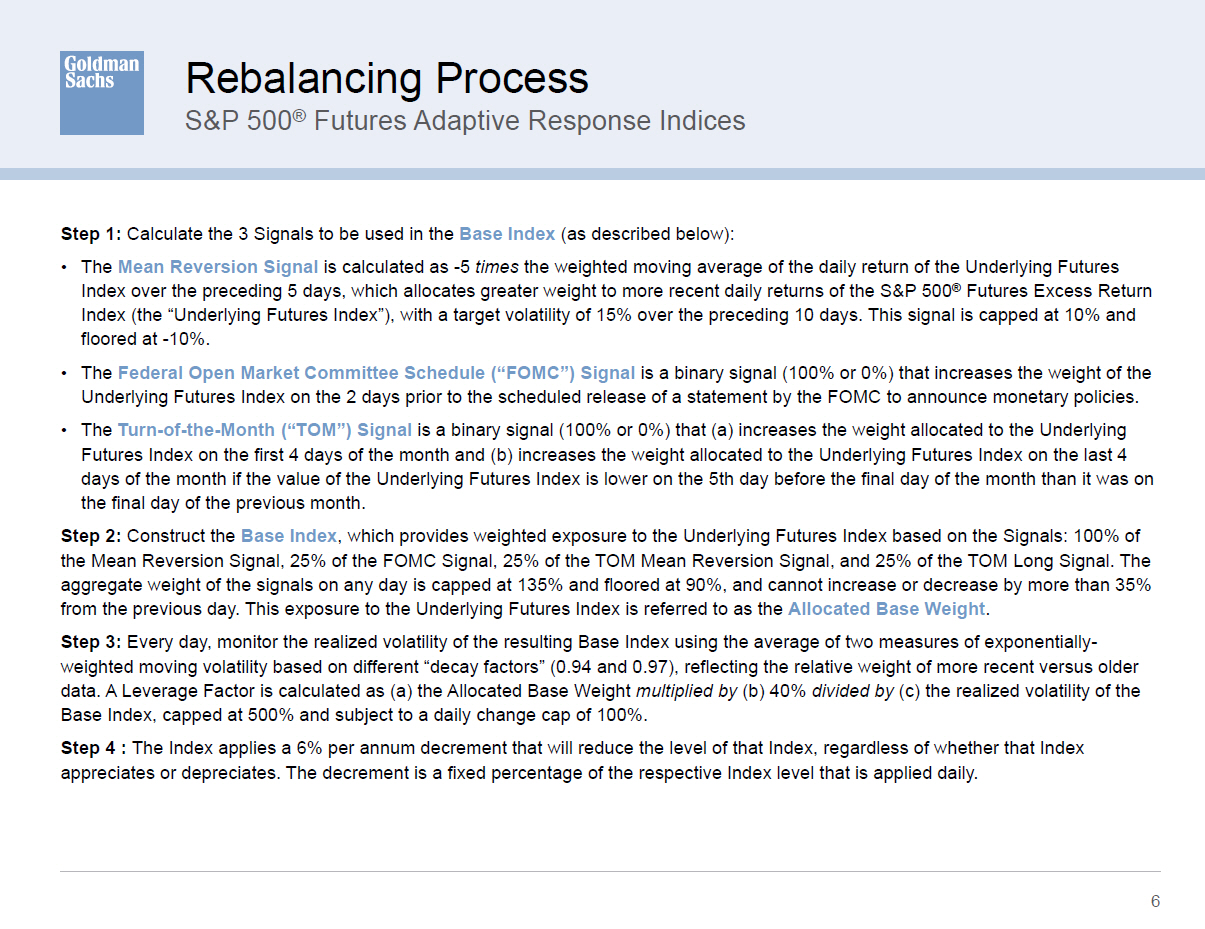 6 Step 1: Calculate the 3 Signals to be used in the Base Index (as described below): • The Mean Reversion Signal is calculated as - 5 times the weighted moving average of the daily return of the Underlying Futures Index over the preceding 5 days, which allocates greater weight to more recent daily returns of the S&P 500 ® Futures Excess Return Index (the “Underlying Futures Index”), with a target volatility of 15% over the preceding 10 days. This signal is capped at 10% and floored at - 10%. • The Federal Open Market Committee Schedule (“FOMC”) Signal is a binary signal (100% or 0%) that increases the weight of the Underlying Futures Index on the 2 days prior to the scheduled release of a statement by the FOMC to announce monetary policie s. • The Turn - of - the - Month (“TOM”) Signal is a binary signal (100% or 0%) that (a) increases the weight allocated to the Underlying Futures Index on the first 4 days of the month and (b) increases the weight allocated to the Underlying Futures Index on the las t 4 days of the month if the value of the Underlying Futures Index is lower on the 5th day before the final day of the month than it was on the final day of the previous month. Step 2: Construct the Base Index , which provides weighted exposure to the Underlying Futures Index based on the Signals: 100% of the Mean Reversion Signal, 25% of the FOMC Signal, 25% of the TOM Mean Reversion Signal, and 25% of the TOM Long Signal. The aggregate weight of the signals on any day is capped at 135% and floored at 90%, and cannot increase or decrease by more than 35 % from the previous day. This exposure to the Underlying Futures Index is referred to as the Allocated Base Weight . Step 3: Every day, monitor the realized volatility of the resulting Base Index using the average of two measures of exponentially - weighted moving volatility based on different “decay factors” (0.94 and 0.97), reflecting the relative weight of more recent ver sus older data. A Leverage Factor is calculated as (a) the Allocated Base Weight multiplied by (b) 40% divided by (c) the realized volatility of the Base Index, capped at 500% and subject to a daily change cap of 100%. Step 4 : The Index applies a 6% per annum decrement that will reduce the level of that Index, regardless of whether that Index appreciates or depreciates. The decrement is a fixed percentage of the respective Index level that is applied daily. S&P 500 ® Futures Adaptive Response Indices Rebalancing Process