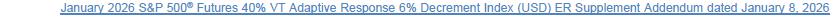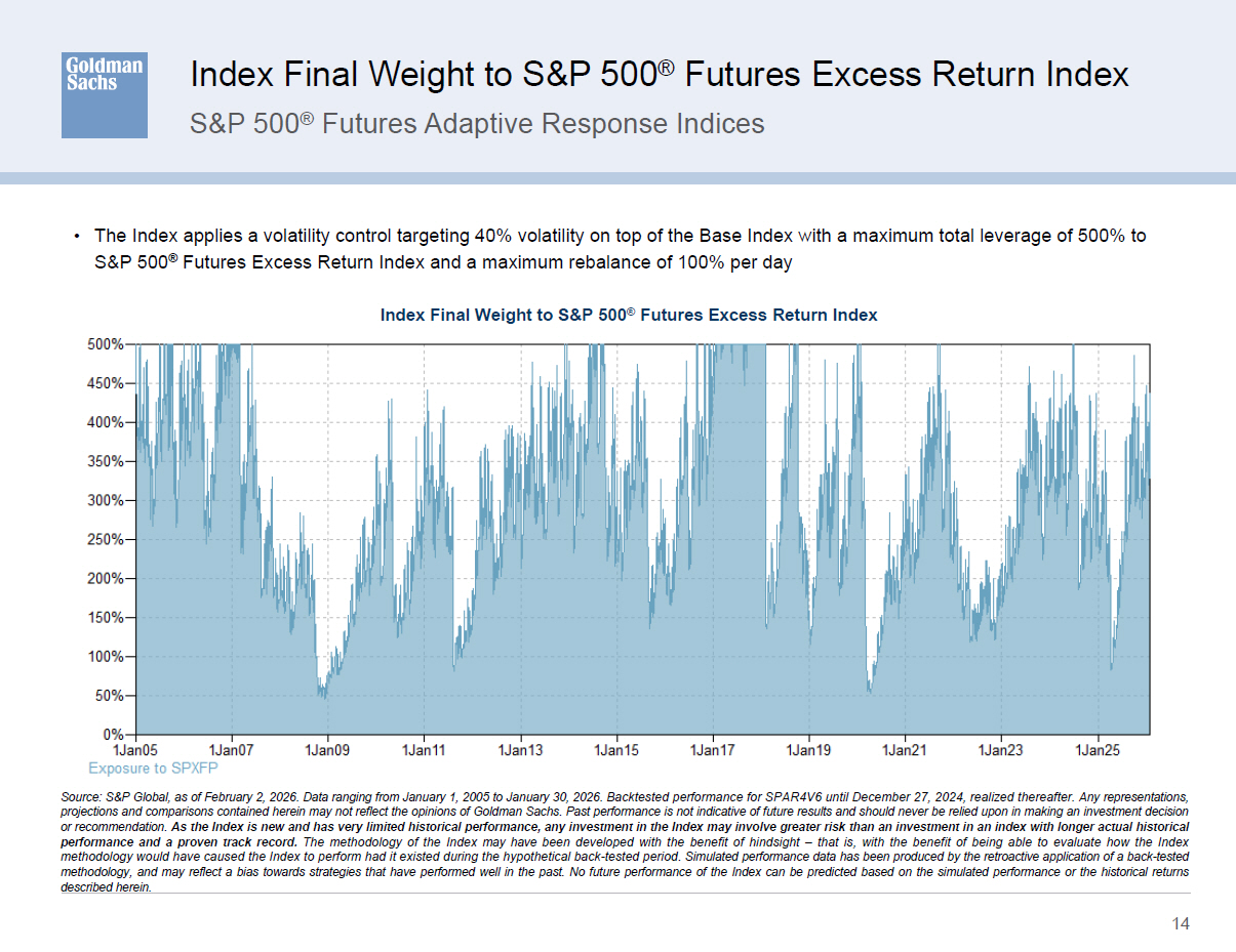 3 • The S&P 500 ® Futures 40% VT Adaptive Response Index (USD) 6% Decrement ER (the “Index” or “SPAR4V6”) attempts to provide exposure to the S &P 500 ® Futures Excess Return Index (“SPXFP”) with a rules - based overlay that adjusts exposure to the S&P 500 ® Futures Excess Return Index on a daily basis. The objective of these rules, taken collectively, is to create an index that provides for volatility - adjusted exposure to the S&P 50 0 ® Futures Excess Return Index, coupled with further adjustments based on calendar - based signals and price patterns, subject to a maximum exposure of 500% and a maximum daily change in leverage of 100%. • The Index is subject to a 6% per annum daily deduction (even when the Index is uninvested). • The S&P 500 ® Futures Adaptive Response Indices are live as of December 27, 2024. S&P 500 ® Futures 40% VT Adaptive Response 6% Decrement Index (USD) ER Index Overview The terms “AR,” “Vol” and “Sharpe” are defined in the Appendix under "Key Terms of Charts/Graphs . ” Source : S&P Global, as of February 2 , 2026 . Data ranging from January 1 , 2005 to January 30 , 2026 . Backtested performance for SPAR 4 V 6 until December 27 , 2024 , realized thereafter . Performance figures are gross of costs and net of index decrement where applicable . Any representations, projections and comparisons contained herein may not reflect the opinions of Goldman Sachs . Past performance is not indicative of future results and should never be relied upon in making an investment decision or recommendation . As the Index is new and has very limited historical performance, any investment in the Index may involve greater risk than an investment in an index with longer actual historical performance and a proven track record . The methodology of the Index may have been developed with the benefit of hindsight – that is, with the benefit of being able to evaluate how the Index methodology would have caused the Index to perform had it existed during the hypothetical back - tested period . Simulated performance data has been produced by the retroactive application of a back - tested methodology, and may reflect a bias towards strategies that have performed well in the past . No future performance of the Index can be predicted based on the simulated performance or the historical returns described herein .