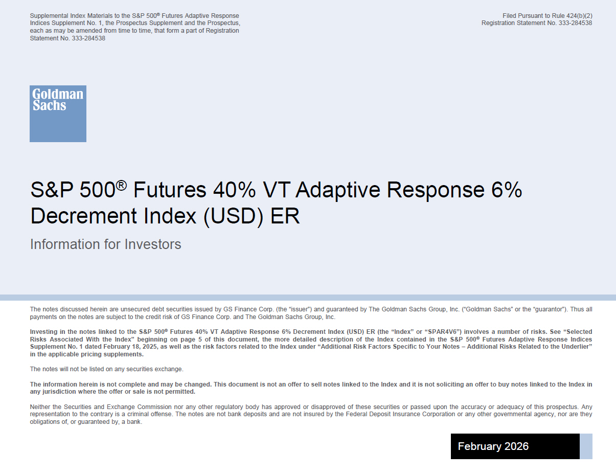 S&P 500 ® Futures 40% VT Adaptive Response 6% Decrement Index (USD) ER Information for Investors February 2026 The notes discussed herein are unsecured debt securities issued by GS Finance Corp . (the “issuer”) and guaranteed by The Goldman Sachs Group, Inc . (“Goldman Sachs” or the “guarantor”) . Thus all payments on the notes are subject to the credit risk of GS Finance Corp . and The Goldman Sachs Group, Inc . Investing in the notes linked to the S&P 500 ® Futures 40 % VT Adaptive Response 6 % Decrement Index (USD) ER (the “Index” or “SPAR 4 V 6 ”) involves a number of risks . See “Selected Risks Associated With the Index” beginning on page 5 of this document, the more detailed description of the Index contained in the S&P 500 ® Futures Adaptive Response Indices Supplement No . 1 dated February 18 , 2025 , as well as the risk factors related to the Index under “Additional Risk Factors Specific to Your Notes – Additional Risks Related to the Underlier” in the applicable pricing supplements . The notes will not be listed on any securities exchange . The information herein is not complete and may be changed . This document is not an offer to sell notes linked to the Index and it is not soliciting an offer to buy notes linked to the Index in any jurisdiction where the offer or sale is not permitted . Neither the Securities and Exchange Commission nor any other regulatory body has approved or disapproved of these securities or passed upon the accuracy or adequacy of this prospectus . Any representation to the contrary is a criminal offense . The notes are not bank deposits and are not insured by the Federal Deposit Insurance Corporation or any other governmental agency, nor are they obligations of, or guaranteed by, a bank . Supplemental Index Materials to the S&P 500 ® Futures Adaptive Response Indices Supplement No. 1, the Prospectus Supplement and the Prospectus, each as may be amended from time to time, that form a part of Registration Statement No. 333 - 284538 Filed Pursuant to Rule 424(b)(2) Registration Statement No. 333 - 284538