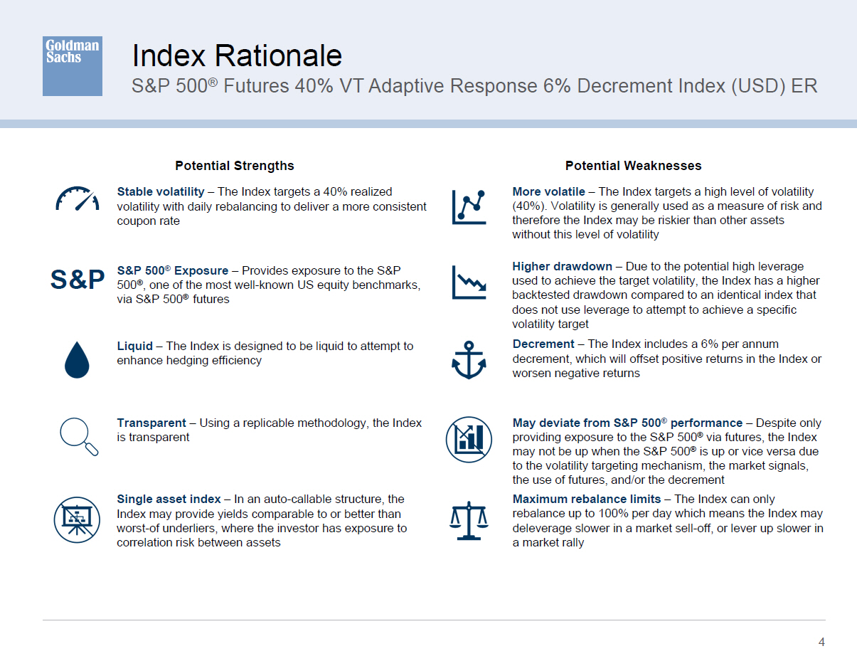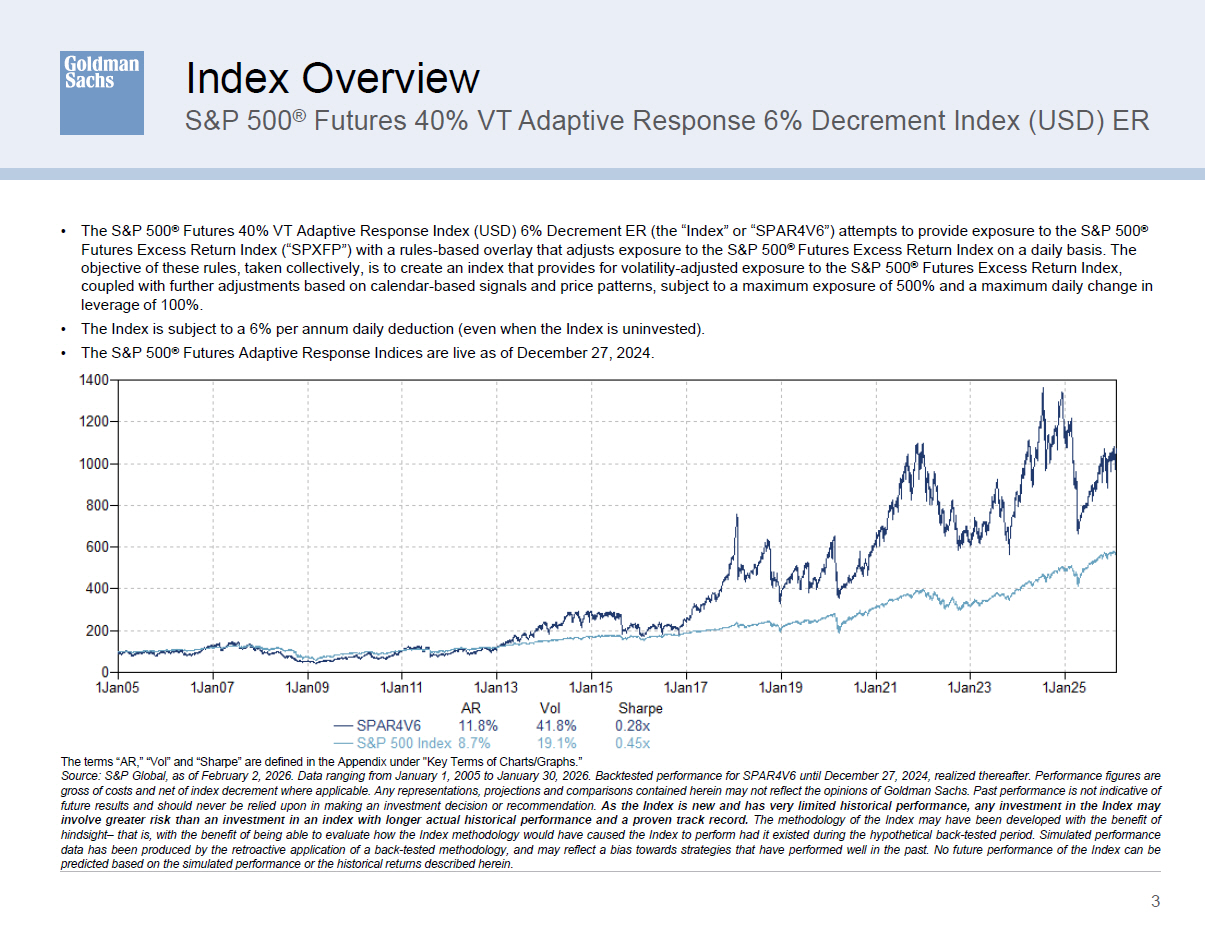 2 IMPORTANT INFORMATION The information contained in this document is for discussion purposes only. Any information relating to performance contained in these materials is illustrative and no assurance is given that any indicative returns, performance or results, whether historical or hypothetical, will be achieved. All information herein is s ubj ect to change without notice, however, Goldman Sachs undertakes no duty to update this information. In the event of any inconsistency between the information presented herein and any offering document re ferenced herein, the offering document shall govern. USE OF HYPOTHETICAL BACKTESTED RETURNS Any backtested historical performance and weighting information included herein is hypothetical. The Index may not have traded in the manner s hown in the hypothetical backtest included herein, and no representation is being made that the Index will achieve similar performance. There are frequently significant differences be twe en hypothetical backtested performance and actual subsequent performance. The results obtained from backtesting information should not be considered indicative of the actual results that might be obtained from an investment in notes refe re ncing the Index. Goldman Sachs provides no assurance that notes linked to the Index will operate or would have operated in the past in a manner consistent w ith these materials. The hypothetical historical levels presented herein have not been verified by an independent third party, and such hypothetical historical levels have inherent limitations. Alternati ve simulations, techniques, modeling or assumptions might produce significantly different results and prove to be more appropriate. Actual results will vary, perhaps materially, from the hypothetical backtested returns presented in this document. PAST PERFORMANCE AND HYPOTHETICAL BACKTESTED PERFORMANCE ARE NOT INDICATIVE OF FUTURE RESULTS. Set forth within this document are some hypothetical backtested performance metrics. The results generated by the product backtesting feature are not indicative of future returns for the selected product. The backtested product performance metrics do not reflect fees or expenses associated with an actual product purchased from Goldman Sachs. Investment suitability must be determined individually for each investor, and investments linked to the Index may not be suit abl e for all investors. This material is not a product of Global Investment Research. Copyright © 2025 Goldman Sachs . All rights reserved. For additional regulatory disclosures, please consult: www.goldmansachs.com/disclosures . Information contained on this website is not incorporated by reference in, and should not be considered part of, this document. ABOUT YOUR PROSPECTUS The prospectus and applicable supplements referenced below contain certain general terms of the notes linked to the S&P 500 ® Futures 40% VT Adaptive Response 6% Decrement Index (USD) ER (the “Index” or “SPAR4V6”). The specific terms of any offering of notes linked to the Index will be set forth in a pricing supplem ent for that offering, which may add, update or modify any information in this document or the prospectus and applicable supplements referenced below. If any information in the applicable pricing suppleme nt is inconsistent with the other offering documents, including this document, you should rely on the information in that pricing supplement. You should read the applicable pricing supplement to get her with the prospectus and applicable supplements referenced below before making a decision to invest in any notes linked to the Index. You may access the prospectus and applicable supplements re ferenced below on the SEC website at www.sec.gov as follows: S&P 500 ® Futures Adaptive Response Indices Supplement No. 1 dated February 18, 2025 January 2026 S&P 500 ® Futures 40% VT Adaptive Response 6% Decrement Index (USD) ER Supplement Addendum dated January 8, 2026 General terms supplement no. 17,745 dated January 20, 2025 Prospectus supplement dated February 14, 2025 Prospectus dated February 14, 2025 Important Information; About Your Prospectus