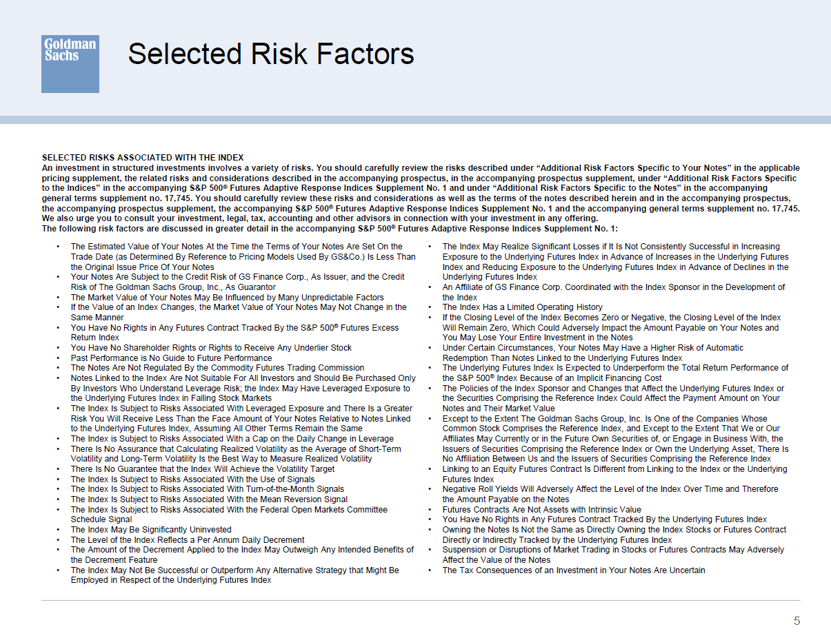5 SELECTED RISKS ASSOCIATED WITH THE INDEX An investment in structured investments involves a variety of risks. You should carefully review the risks described under “Additional Risk Factors Specific to Your Notes” in the applicable pricing supplement, the related risks and considerations described in the accompanying prospectus, in the accompanying prospe ctu s supplement, under “Additional Risk Factors Specific to the Indices” in the accompanying S&P 500 ® Futures Adaptive Response Indices Supplement No. 1 and under “Additional Risk Factors Specific to the Notes” in the accompany in g general terms supplement no. 17,745. You should carefully review these risks and considerations as well as the terms of the n ote s described herein and in the accompanying prospectus, the accompanying prospectus supplement, the accompanying S&P 500 ® Futures Adaptive Response Indices Supplement No. 1 and the accompanying general terms supplement no. 17,745. We also urge you to consult your investment, legal, tax, accounting and other advisors in connection with your investment in any offering. The following risk factors are discussed in greater detail in the accompanying S&P 500 ® Futures Adaptive Response Indices Supplement No. 1: Selected Risk Factors • The Estimated Value of Your Notes At the Time the Terms of Your Notes Are Set On the Trade Date (as Determined By Reference to Pricing Models Used By GS&Co .) Is Less Than the Original Issue Price Of Your Notes • Your Notes Are Subject to the Credit Risk of GS Finance Corp., As Issuer, and the Credit Risk of The Goldman Sachs Group, Inc., As Guarantor • The Market Value of Your Notes May Be Influenced by Many Unpredictable Factors • If the Value of an Index Changes, the Market Value of Your Notes May Not Change in the Same Manner • You Have No Rights in Any Futures Contract Tracked By the S&P 500 ® Futures Excess Return Index • You Have No Shareholder Rights or Rights to Receive Any Underlier Stock • Past Performance is No Guide to Future Performance • The Notes Are Not Regulated By the Commodity Futures Trading Commission • Notes Linked to the Index Are Not Suitable For All Investors and Should Be Purchased Only By Investors Who Understand Leverage Risk; the Index May Have Leveraged Exposure to the Underlying Futures Index in Falling Stock Markets • The Index Is Subject to Risks Associated With Leveraged Exposure and There Is a Greater Risk You Will Receive Less Than the Face Amount of Your Notes Relative to Notes Linked to the Underlying Futures Index, Assuming All Other Terms Remain the Same • The Index is Subject to Risks Associated With a Cap on the Daily Change in Leverage • There Is No Assurance that Calculating Realized Volatility as the Average of Short - Term Volatility and Long - Term Volatility Is the Best Way to Measure Realized Volatility • There Is No Guarantee that the Index Will Achieve the Volatility Target • The Index Is Subject to Risks Associated With the Use of Signals • The Index Is Subject to Risks Associated With Turn - of - the - Month Signals • The Index Is Subject to Risks Associated With the Mean Reversion Signal • The Index Is Subject to Risks Associated With the Federal Open Markets Committee Schedule Signal • The Index May Be Significantly Uninvested • The Level of the Index Reflects a Per Annum Daily Decrement • The Amount of the Decrement Applied to the Index May Outweigh Any Intended Benefits of the Decrement Feature • The Index May Not Be Successful or Outperform Any Alternative Strategy that Might Be Employed in Respect of the Underlying Futures Index • The Index May Realize Significant Losses if It Is Not Consistently Successful in Increasing Exposure to the Underlying Futures Index in Advance of Increases in the Underlying Futures Index and Reducing Exposure to the Underlying Futures Index in Advance of Declines in the Underlying Futures Index • An Affiliate of GS Finance Corp. Coordinated with the Index Sponsor in the Development of the Index • The Index Has a Limited Operating History • If the Closing Level of the Index Becomes Zero or Negative, the Closing Level of the Index Will Remain Zero, Which Could Adversely Impact the Amount Payable on Your Notes and You May Lose Your Entire Investment in the Notes • Under Certain Circumstances, Your Notes May Have a Higher Risk of Automatic Redemption Than Notes Linked to the Underlying Futures Index • The Underlying Futures Index Is Expected to Underperform the Total Return Performance of the S&P 500 ® Index Because of an Implicit Financing Cost • The Policies of the Index Sponsor and Changes that Affect the Underlying Futures Index or the Securities Comprising the Reference Index Could Affect the Payment Amount on Your Notes and Their Market Value • Except to the Extent The Goldman Sachs Group, Inc. Is One of the Companies Whose Common Stock Comprises the Reference Index, and Except to the Extent That We or Our Affiliates May Currently or in the Future Own Securities of, or Engage in Business With, the Issuers of Securities Comprising the Reference Index or Own the Underlying Asset, There Is No Affiliation Between Us and the Issuers of Securities Comprising the Reference Index • Linking to an Equity Futures Contract Is Different from Linking to the Index or the Underlying Futures Index • Negative Roll Yields Will Adversely Affect the Level of the Index Over Time and Therefore the Amount Payable on the Notes • Futures Contracts Are Not Assets with Intrinsic Value • You Have No Rights in Any Futures Contract Tracked By the Underlying Futures Index • Owning the Notes Is Not the Same as Directly Owning the Index Stocks or Futures Contract Directly or Indirectly Tracked by the Underlying Futures Index • Suspension or Disruptions of Market Trading in Stocks or Futures Contracts May Adversely Affect the Value of the Notes • The Tax Consequences of an Investment in Your Notes Are Uncertain