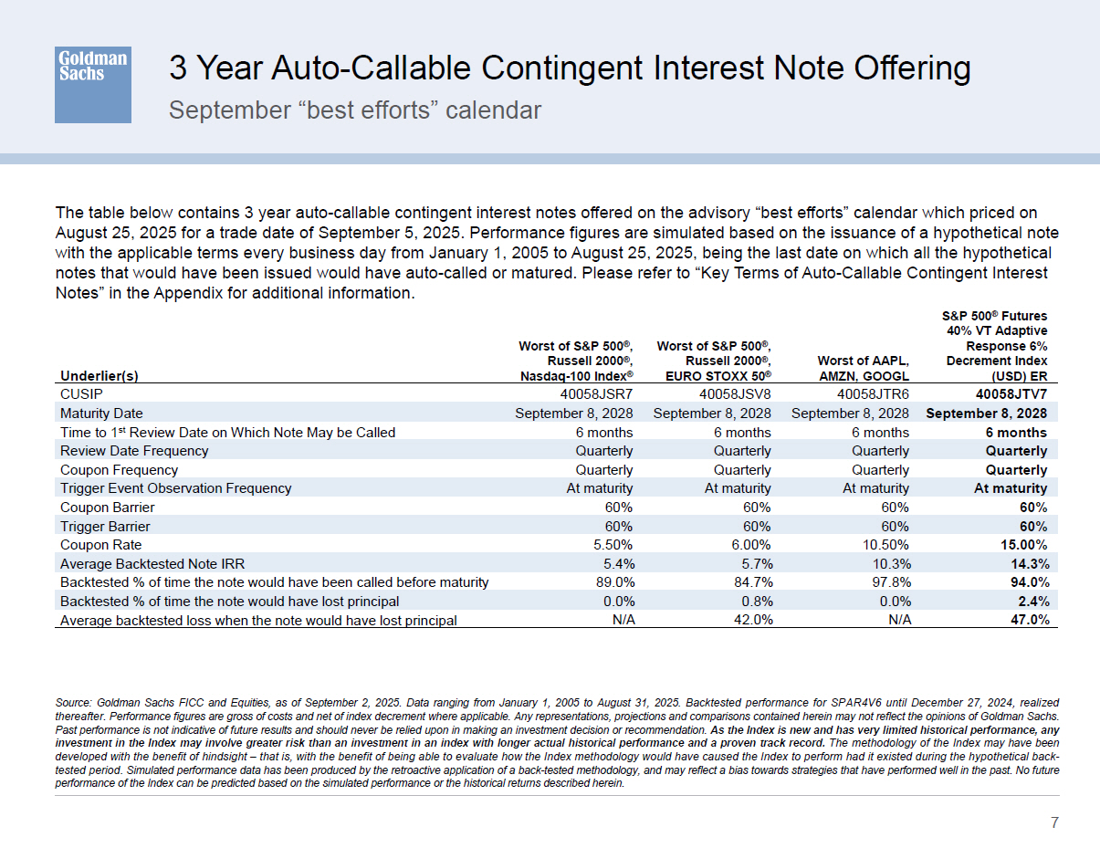 8 The table below contains 5 year auto - callable contingent interest notes offered on the advisory “best efforts” calendar which pr iced on August 25, 2025 for a trade date of September 5, 2025. Performance figures are simulated based on the issuance of a hypotheti cal note with the applicable terms every business day from January 1, 2005 to August 25, 2025, being the last date on which all the hy pot hetical notes that would have been issued would have auto - called or matured. Please refer to “Key Terms of Auto - Callable Contingent Inte rest Notes” in the Appendix for additional information. September “best efforts” calendar 5 Year Auto - Callable Contingent Interest Note Offering Source : Goldman Sachs FICC and Equities, as of September 2 , 2025 . Data ranging from January 1 , 2005 to August 31 , 2025 . Backtested performance for SPAR 4 V 6 until December 27 , 2024 , realized thereafter . Performance figures are gross of costs and net of index decrement where applicable . Any representations, projections and comparisons contained herein may not reflect the opinions of Goldman Sachs . Past performance is not indicative of future results and should never be relied upon in making an investment decision or recommendation . As the Index is new and has very limited historical performance, any investment in the Index may involve greater risk than an investment in an index with longer actual historical performance and a proven track record . The methodology of the Index may have been developed with the benefit of hindsight – that is, with the benefit of being able to evaluate how the Index methodology would have caused the Index to perform had it existed during the hypothetical back - tested period . Simulated performance data has been produced by the retroactive application of a back - tested methodology, and may reflect a bias towards strategies that have performed well in the past . No future performance of the Index can be predicted based on the simulated performance or the historical returns described herein . S&P 500 ® Futures 40% VT Adaptive Response 6% Decrement Index (USD) ER Worst of AAPL, AMZN, GOOGL Worst of S&P 500 ® , Russell 2000 ® , EURO STOXX 50 ® Worst of S&P 500 ® , Russell 2000 ® , Nasdaq - 100 Index ® Underlier(s) 40058JW92 40058JUM5 40058JU52 40058JTZ8 CUSIP September 5, 2030 September 5, 2030 September 5, 2030 September 5, 2030 Maturity Date 6 months 6 months 6 months 6 months Time to 1 st Review Date on Which Note May be Called Quarterly Quarterly Quarterly Quarterly Review Date Frequency Quarterly Quarterly Quarterly Quarterly Coupon Frequency At maturity At maturity At maturity At maturity Trigger Event Observation Frequency 70% 70% 70% 70% Coupon Barrier 50% 50% 50% 50% Trigger Barrier 18.00% 11.00% 6.15% 5.60% Coupon Rate 17.3% 10.8% 5.6% 5.5% Average Backtested Note IRR 96.4% 99.3% 89.8% 94.9% Backtested % of time the note would have been called before maturity 0.0% 0.0% 1.1% 0.0% Backtested % of time the note would have lost principal N/A N/A 51.6% N/A Average backtested loss when the note would have lost principal