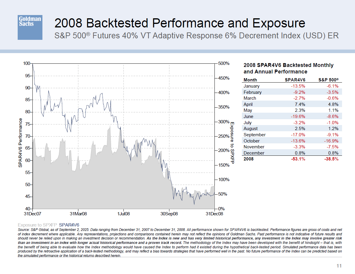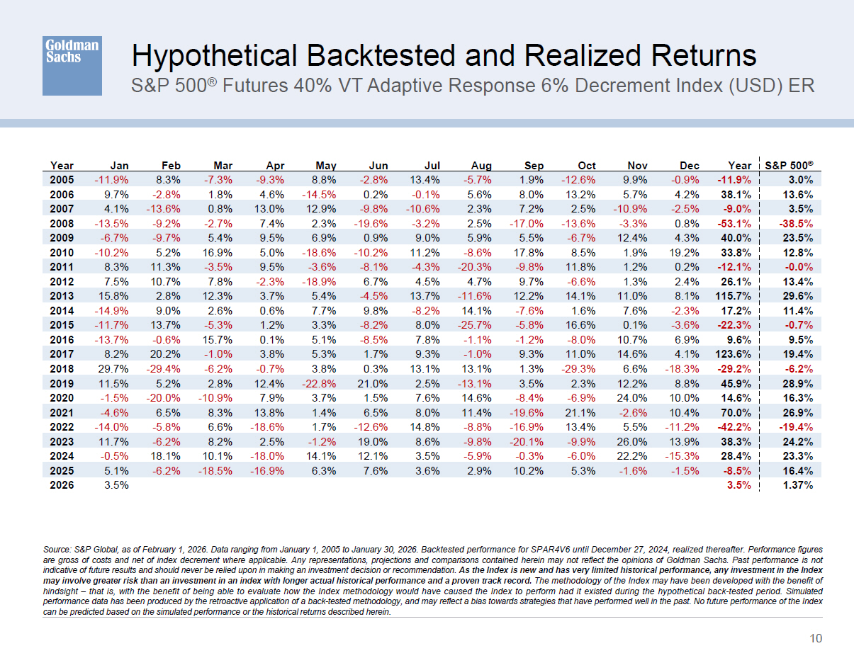 10 S&P 500 ® Year Dec Nov Oct Sep Aug Jul Jun May Apr Mar Feb Jan Year 3.0% - 11.9% - 0.9% 9.9% - 12.6% 1.9% - 5.7% 13.4% - 2.8% 8.8% - 9.3% - 7.3% 8.3% - 11.9% 2005 13.6% 38.1% 4.2% 5.7% 13.2% 8.0% 5.6% - 0.1% 0.2% - 14.5% 4.6% 1.8% - 2.8% 9.7% 2006 3.5% - 9.0% - 2.5% - 10.9% 2.5% 7.2% 2.3% - 10.6% - 9.8% 12.9% 13.0% 0.8% - 13.6% 4.1% 2007 - 38.5% - 53.1% 0.8% - 3.3% - 13.6% - 17.0% 2.5% - 3.2% - 19.6% 2.3% 7.4% - 2.7% - 9.2% - 13.5% 2008 23.5% 40.0% 4.3% 12.4% - 6.7% 5.5% 5.9% 9.0% 0.9% 6.9% 9.5% 5.4% - 9.7% - 6.7% 2009 12.8% 33.8% 19.2% 1.9% 8.5% 17.8% - 8.6% 11.2% - 10.2% - 18.6% 5.0% 16.9% 5.2% - 10.2% 2010 - 0.0% - 12.1% 0.2% 1.2% 11.8% - 9.8% - 20.3% - 4.3% - 8.1% - 3.6% 9.5% - 3.5% 11.3% 8.3% 2011 13.4% 26.1% 2.4% 1.3% - 6.6% 9.7% 4.7% 4.5% 6.7% - 18.9% - 2.3% 7.8% 10.7% 7.5% 2012 29.6% 115.7% 8.1% 11.0% 14.1% 12.2% - 11.6% 13.7% - 4.5% 5.4% 3.7% 12.3% 2.8% 15.8% 2013 11.4% 17.2% - 2.3% 7.6% 1.6% - 7.6% 14.1% - 8.2% 9.8% 7.7% 0.6% 2.6% 9.0% - 14.9% 2014 - 0.7% - 22.3% - 3.6% 0.1% 16.6% - 5.8% - 25.7% 8.0% - 8.2% 3.3% 1.2% - 5.3% 13.7% - 11.7% 2015 9.5% 9.6% 6.9% 10.7% - 8.0% - 1.2% - 1.1% 7.8% - 8.5% 5.1% 0.1% 15.7% - 0.6% - 13.7% 2016 19.4% 123.6% 4.1% 14.6% 11.0% 9.3% - 1.0% 9.3% 1.7% 5.3% 3.8% - 1.0% 20.2% 8.2% 2017 - 6.2% - 29.2% - 18.3% 6.6% - 29.3% 1.3% 13.1% 13.1% 0.3% 3.8% - 0.7% - 6.2% - 29.4% 29.7% 2018 28.9% 45.9% 8.8% 12.2% 2.3% 3.5% - 13.1% 2.5% 21.0% - 22.8% 12.4% 2.8% 5.2% 11.5% 2019 16.3% 14.6% 10.0% 24.0% - 6.9% - 8.4% 14.6% 7.6% 1.5% 3.7% 7.9% - 10.9% - 20.0% - 1.5% 2020 26.9% 70.0% 10.4% - 2.6% 21.1% - 19.6% 11.4% 8.0% 6.5% 1.4% 13.8% 8.3% 6.5% - 4.6% 2021 - 19.4% - 42.2% - 11.2% 5.5% 13.4% - 16.9% - 8.8% 14.8% - 12.6% 1.7% - 18.6% 6.6% - 5.8% - 14.0% 2022 24.2% 38.3% 13.9% 26.0% - 9.9% - 20.1% - 9.8% 8.6% 19.0% - 1.2% 2.5% 8.2% - 6.2% 11.7% 2023 23.3% 28.4% - 15.3% 22.2% - 6.0% - 0.3% - 5.9% 3.5% 12.1% 14.1% - 18.0% 10.1% 18.1% - 0.5% 2024 16.4% - 8.5% - 1.5% - 1.6% 5.3% 10.2% 2.9% 3.6% 7.6% 6.3% - 16.9% - 18.5% - 6.2% 5.1% 2025 1.37% 3.5% 3.5% 2026 S&P 500 ® Futures 40% VT Adaptive Response 6% Decrement Index (USD) ER Hypothetical Backtested and Realized Returns Source : S&P Global, as of February 1 , 2026 . Data ranging from January 1 , 2005 to January 30 , 2026 . Backtested performance for SPAR 4 V 6 until December 27 , 2024 , realized thereafter . Performance figures are gross of costs and net of index decrement where applicable . Any representations, projections and comparisons contained herein may not reflect the opinions of Goldman Sachs . Past performance is not indicative of future results and should never be relied upon in making an investment decision or recommendation . As the Index is new and has very limited historical performance, any investment in the Index may involve greater risk than an investment in an index with longer actual historical performance and a proven track record . The methodology of the Index may have been developed with the benefit of hindsight – that is, with the benefit of being able to evaluate how the Index methodology would have caused the Index to perform had it existed during the hypothetical back - tested period . Simulated performance data has been produced by the retroactive application of a back - tested methodology, and may reflect a bias towards strategies that have performed well in the past . No future performance of the Index can be predicted based on the simulated performance or the historical returns described herein .