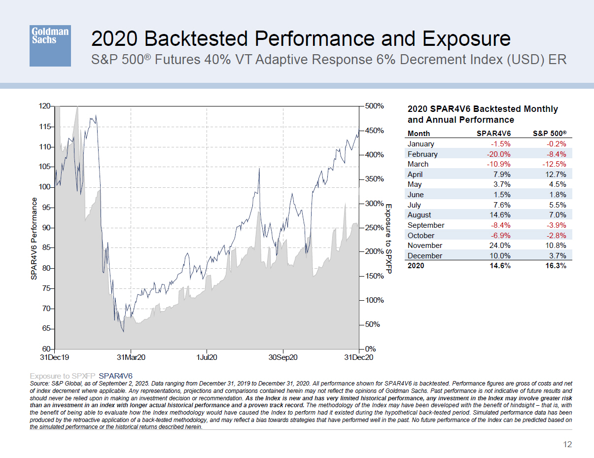 11 S&P 500 ® Futures 40% VT Adaptive Response 6% Decrement Index (USD) ER 2008 Backtested Performance and Exposure S&P 500 ® SPAR4V6 Month - 6.1% - 13.5% January - 3.5% - 9.2% February - 0.6% - 2.7% March 4.8% 7.4% April 1.1% 2.3% May - 8.6% - 19.6% June - 1.0% - 3.2% July 1.2% 2.5% August - 9.1% - 17.0% September - 16.9% - 13.6% October - 7.5% - 3.3% November 0.8% 0.8% December - 38.5% - 53.1% 2008 2008 SPAR4V6 Backtested Monthly and Annual Performance Source : S&P Global, as of September 2 , 2025 . Data ranging from December 31 , 2007 to December 31 , 2008 . All performance shown for SPAR 4 V 6 is backtested . Performance figures are gross of costs and net of index decrement where applicable . Any representations, projections and comparisons contained herein may not reflect the opinions of Goldman Sachs . Past performance is not indicative of future results and should never be relied upon in making an investment decision or recommendation . As the Index is new and has very limited historical performance, any investment in the Index may involve greater risk than an investment in an index with longer actual historical performance and a proven track record . The methodology of the Index may have been developed with the benefit of hindsight – that is, with the benefit of being able to evaluate how the Index methodology would have caused the Index to perform had it existed during the hypothetical back - tested period . Simulated performance data has been produced by the retroactive application of a back - tested methodology, and may reflect a bias towards strategies that have performed well in the past . No future performance of the Index can be predicted based on the simulated performance or the historical returns described herein . Exposure to SPXFPSPAR4V6 SPAR4V6 Performance Exposure to SPXFP 40 45 50 55 60 65 70 75 80 85 90 95 100 0% 50% 100% 150% 200% 250% 300% 350% 400% 450% 500% 31Dec07 31Mar08 1Jul08 30Sep08 31Dec08