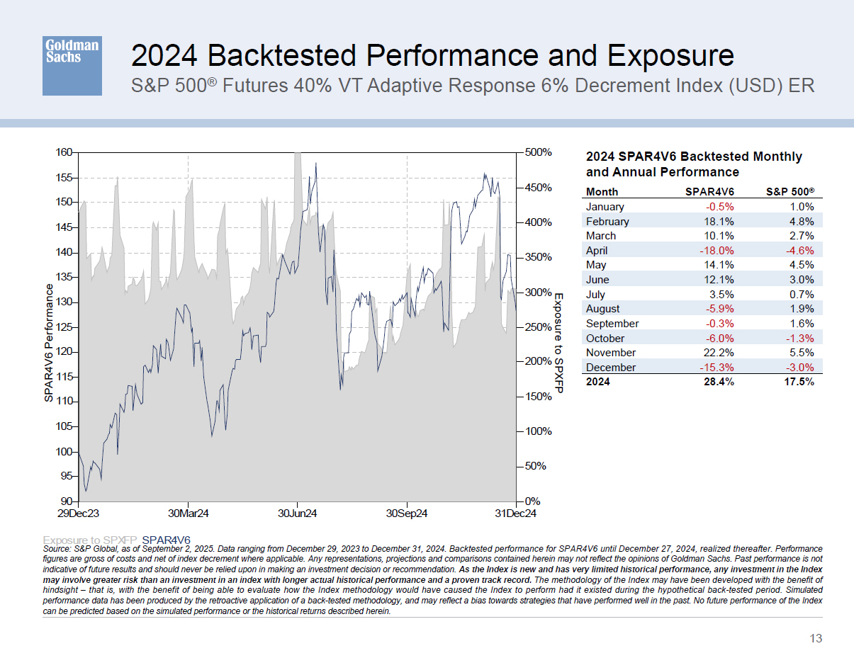 12 S&P 500 ® Futures 40% VT Adaptive Response 6% Decrement Index (USD) ER 2020 Backtested Performance and Exposure S&P 500 ® SPAR4V6 Month - 0.2% - 1.5% January - 8.4% - 20.0% February - 12.5% - 10.9% March 12.7% 7.9% April 4.5% 3.7% May 1.8% 1.5% June 5.5% 7.6% July 7.0% 14.6% August - 3.9% - 8.4% September - 2.8% - 6.9% October 10.8% 24.0% November 3.7% 10.0% December 16.3% 14.6% 2020 2020 SPAR4V6 Backtested Monthly and Annual Performance Source : S&P Global, as of September 2 , 2025 . Data ranging from December 31 , 2019 to December 31 , 2020 . All performance shown for SPAR 4 V 6 is backtested . Performance figures are gross of costs and net of index decrement where applicable . Any representations, projections and comparisons contained herein may not reflect the opinions of Goldman Sachs . Past performance is not indicative of future results and should never be relied upon in making an investment decision or recommendation . As the Index is new and has very limited historical performance, any investment in the Index may involve greater risk than an investment in an index with longer actual historical performance and a proven track record . The methodology of the Index may have been developed with the benefit of hindsight – that is, with the benefit of being able to evaluate how the Index methodology would have caused the Index to perform had it existed during the hypothetical back - tested period . Simulated performance data has been produced by the retroactive application of a back - tested methodology, and may reflect a bias towards strategies that have performed well in the past . No future performance of the Index can be predicted based on the simulated performance or the historical returns described herein . Exposure to SPXFPSPAR4V6 SPAR4V6 Performance Exposure to SPXFP 60 65 70 75 80 85 90 95 100 105 110 115 120 0% 50% 100% 150% 200% 250% 300% 350% 400% 450% 500% 31Dec19 31Mar20 1Jul20 30Sep20 31Dec20