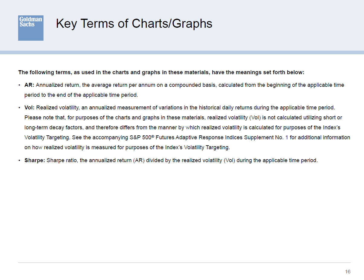 16 The following terms, as used in the charts and graphs in these materials, have the meanings set forth below: • AR: Annualized return, the average return per annum on a compounded basis, calculated from the beginning of the applicable time period to the end of the applicable time period. • Vol: Realized volatility, an annualized measurement of variations in the historical daily returns during the applicable time perio d. Please note that, for purposes of the charts and graphs in these materials, realized volatility (Vol) is not calculated utili zin g short or long - term decay factors, and therefore differs from the manner by which realized volatility is calculated for purposes of the In dex’s Volatility Targeting. See the accompanying S&P 500 ® Futures Adaptive Response Indices Supplement No. 1 for additional information on how realized volatility is measured for purposes of the Index’s Volatility Targeting. • Sharpe: Sharpe ratio, the annualized return (AR) divided by the realized volatility (Vol) during the applicable time period. Key Terms of Charts/Graphs