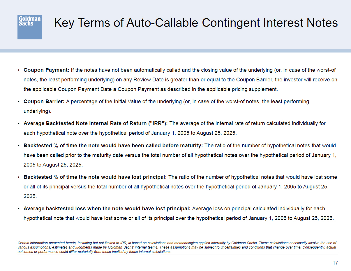 17 • Coupon Payment: If the notes have not been automatically called and the closing value of the underlying (or, in case of the worst - of notes, the least performing underlying) on any Review Date is greater than or equal to the Coupon Barrier, the investor will rec eive on the applicable Coupon Payment Date a Coupon Payment as described in the applicable pricing supplement. • Coupon Barrier: A percentage of the Initial Value of the underlying (or, in case of the worst - of notes, the least performing underlying). • Average Backtested Note Internal Rate of Return ("IRR"): The average of the internal rate of return calculated individually for each hypothetical note over the hypothetical period of January 1, 2005 to August 25, 2025. • Backtested % of time the note would have been called before maturity: The ratio of the number of hypothetical notes that would have been called prior to the maturity date versus the total number of all hypothetical notes over the hypothetical period of Ja nuary 1, 2005 to August 25, 2025. • Backtested % of time the note would have lost principal: The ratio of the number of hypothetical notes that would have lost some or all of its principal versus the total number of all hypothetical notes over the hypothetical period of January 1, 2005 to Aug ust 25, 2025. • Average backtested loss when the note would have lost principal: Average loss on principal calculated individually for each hypothetical note that would have lost some or all of its principal over the hypothetical period of January 1, 2005 to August 25 , 2025. Certain information presented herein, including but not limited to IRR, is based on calculations and methodologies applied in ter nally by Goldman Sachs. These calculations necessarily involve the use of various assumptions, estimates and judgments made by Goldman Sachs' internal teams. These assumptions may be subject to uncer tai nties and conditions that change over time. Consequently, actual outcomes or performance could differ materially from those implied by these internal calculations. Key Terms of Auto - Callable Contingent Interest Notes