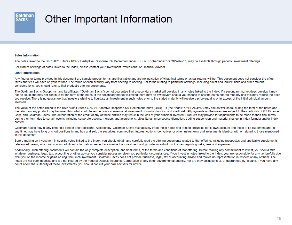 19 Sales Information The notes linked to the S&P 500 ® Futures 40% VT Adaptive Response 6% Decrement Index (USD) ER (the “Index” or “SPAR4V6”) may be available through periodic inv es tment offerings. For current offerings of notes linked to the Index, please contact your Investment Professional or Financial Advisor. Other Information Any figures or terms provided in this document are sample product terms, are illustrative and are no indication of what final te rms or actual returns will be. This document does not consider the effect taxes and fees will have on your returns. The terms of each security vary from offering to offering. For terms relating to pa rti cular offerings, including direct and indirect risks and other material considerations, you should refer to that product’s offering documents. The Goldman Sachs Group, Inc. and its affiliates (“Goldman Sachs”) do not guarantee that a secondary market will develop in a ny notes linked to the Index. If a secondary market does develop it may not be liquid and may not continue for the term of the notes. If the secondary market is limited there may be few buyers shou ld you choose to sell the notes prior to maturity and this may reduce the price you receive. There is no guarantee that investors wishing to liquidate an investment in such notes prior to the stated maturi ty will receive a price equal to or in excess of the initial principal amount invested. The value of the notes linked to the S&P 500 ® Futures 40% VT Adaptive Response 6% Decrement Index (USD) ER (the “Index” or “SPAR4V6”) may rise as well as fall during the t er m of the notes and the return on any product may be lower than what could be earned on a conventional investment of similar duration and credit ris k. All payments on the notes are subject to the credit risk of GS Finance Corp. and Goldman Sachs. The deterioration of the credit of any of these entities may result in the loss of your principal in ves ted. Products may provide for adjustments to be made to their final terms during their term due to certain events including corporate actions, mergers and acquisitions, divestitures, price source dis rup tion, trading suspension and material change in Index formula and/or Index content. Goldman Sachs may at any time hold long or short positions. Accordingly, Goldman Sachs may actively trade these notes and rel ate d securities for its own account and those of its customers and, at any time, may have long or short positions in and buy and sell, the securities, commodities, futures, options, derivatives or ot her instruments and investments identical with or related to those mentioned in this document. Before making an investment in specific notes linked to the Index, you should obtain and carefully read the offering document s r elated to that offering, including prospectus and applicable supplements referenced herein, which will contain additional information needed to evaluate the investment and provide important disclosu res regarding risks, fees and expenses. Additionally, such offering documents will contain the only complete description, and final terms, of the terms and condition s o f that offering. Before making any commitment to invest, you should take whatever business, legal, tax, accounting or other advice you consider necessary given you particular circumstances. If you i nve st in notes linked to the Index, you are responsible for any tax lawfully due from you on the income or gains arising from such investment. Goldman Sachs does not provide business, legal, tax or accounti ng advice and makes no representation in respect of any of them. The notes are not bank deposits and are not insured by the Federal Deposit Insurance Corporation or any other governmental agency , n or are they obligations of, or guaranteed by, a bank. If you have any doubt about the suitability of these investments, you should consult your own advisers for advice. Other Important Information