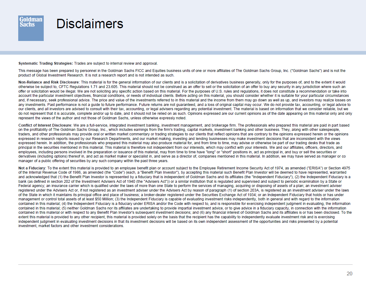 20 Systematic Trading Strategies: Trades are subject to internal review and approval. This message has been prepared by personnel in the Goldman Sachs FICC and Equities business units of one or more affiliates o f T he Goldman Sachs Group, Inc. ("Goldman Sachs") and is not the product of Global Investment Research. It is not a research report and is not intended as such. Non - Reliance and Risk Disclosure : This material is for the general information of our clients and is a solicitation of derivatives business generally, only f or the purposes of, and to the extent it would otherwise be subject to, CFTC Regulations 1.71 and 23.605. This material should not be construed as an offer to sell or the s oli citation of an offer to buy any security in any jurisdiction where such an offer or solicitation would be illegal. We are not soliciting any specific action based on this material. For the purposes of U. S. rules and regulations, it does not constitute a recommendation or take into account the particular investment objectives, financial conditions, or needs of individual clients. Before acting on this mat eri al, you should consider whether it is suitable for your particular circumstances and, if necessary, seek professional advice. The price and value of the investments referred to in this material and the inco me from them may go down as well as up, and investors may realize losses on any investments. Past performance is not a guide to future performance. Future returns are not guaranteed, and a loss of orig ina l capital may occur. We do not provide tax, accounting, or legal advice to our clients, and all investors are advised to consult with their tax, accounting, or legal advisers regarding any potential i nve stment. The material is based on information that we consider reliable, but we do not represent that it is accurate, complete and/or up to date, and it should not be relied on as such. Opinions expressed are our current opinions as of the date appearing on this material only and only represent the views of the author and not those of Goldman Sachs, unless otherwise expressly noted. Conflict of Interest Disclosure : We are a full - service, integrated investment banking, investment management, and brokerage firm. The professionals who prepare d this material are paid in part based on the profitability of The Goldman Sachs Group, Inc., which includes earnings from the firm's trading, capital markets, inve stm ent banking and other business. They, along with other salespeople, traders, and other professionals may provide oral or written market commentary or trading strategies to our clients that refl ect opinions that are contrary to the opinions expressed herein or the opinions expressed in research reports issued by our Research Departments, and our market making, investing and lending businesses may ma ke investment decisions that are inconsistent with the views expressed herein. In addition, the professionals who prepared this material may also produce material for, and from time to t ime , may advise or otherwise be part of our trading desks that trade as principal in the securities mentioned in this material. This material is therefore not independent from our interests, which may conflict with your interests. We and our affiliates, officers, directors, and employees, including persons involved in the preparation or issuance of this material, may from time to time have "long" or " sho rt" positions in, act as principal in, and buy or sell the securities or derivatives (including options) thereof in, and act as market maker or specialist in, and serve as a director of, companies m ent ioned in this material. In addition, we may have served as manager or co manager of a public offering of securities by any such company within the past three years. Not a Fiduciary : To the extent this material is provided to an employee benefit plan or account subject to the Employee Retirement Income Se cur ity Act of 1974, as amended ("ERISA") or Section 4975 of the Internal Revenue Code of 1986, as amended (the "Code") (each, a "Benefit Plan Investor"), by accepting this material s uch Benefit Plan Investor will be deemed to have represented, warranted and acknowledged that (1) the Benefit Plan Investor is represented by a fiduciary that is independent of Goldman Sachs and it s a ffiliates (the "Independent Fiduciary"), (2) the Independent Fiduciary is a bank (as defined in section 202 of the Investment Advisers Act of 1940 (the "Advisers Act")) or a similar institution that is re gulated and supervised and subject to periodic examination by a State or Federal agency; an insurance carrier which is qualified under the laws of more than one State to perform the services of mana gin g, acquiring or disposing of assets of a plan; an investment adviser registered under the Advisers Act or, if not registered as an investment adviser under the Advisers Act by reason of paragrap h ( 1) of section 203A, is registered as an investment adviser under the laws of the State in which it maintains its principal office and place of business; a broker - dealer registered under the Securities E xchange Act of 1934; or an Independent Fiduciary that holds or has under management or control total assets of at least $50 Million; (3) the Independent Fiduciary is capable of evaluating investment ri sks independently, both in general and with regard to the information contained in this material; (4) the Independent Fiduciary is a fiduciary under ERISA and/or the Code with respect to, and is res ponsible for exercising independent judgment in evaluating, the information contained in this material; (5) neither Goldman Sachs nor its affiliates are undertaking to provide impartial investment advi ce, or to give advice in a fiduciary capacity, in connection with the information contained in this material or with respect to any Benefit Plan Investor's subsequent investment decisions; and (6) any financ ial interest of Goldm