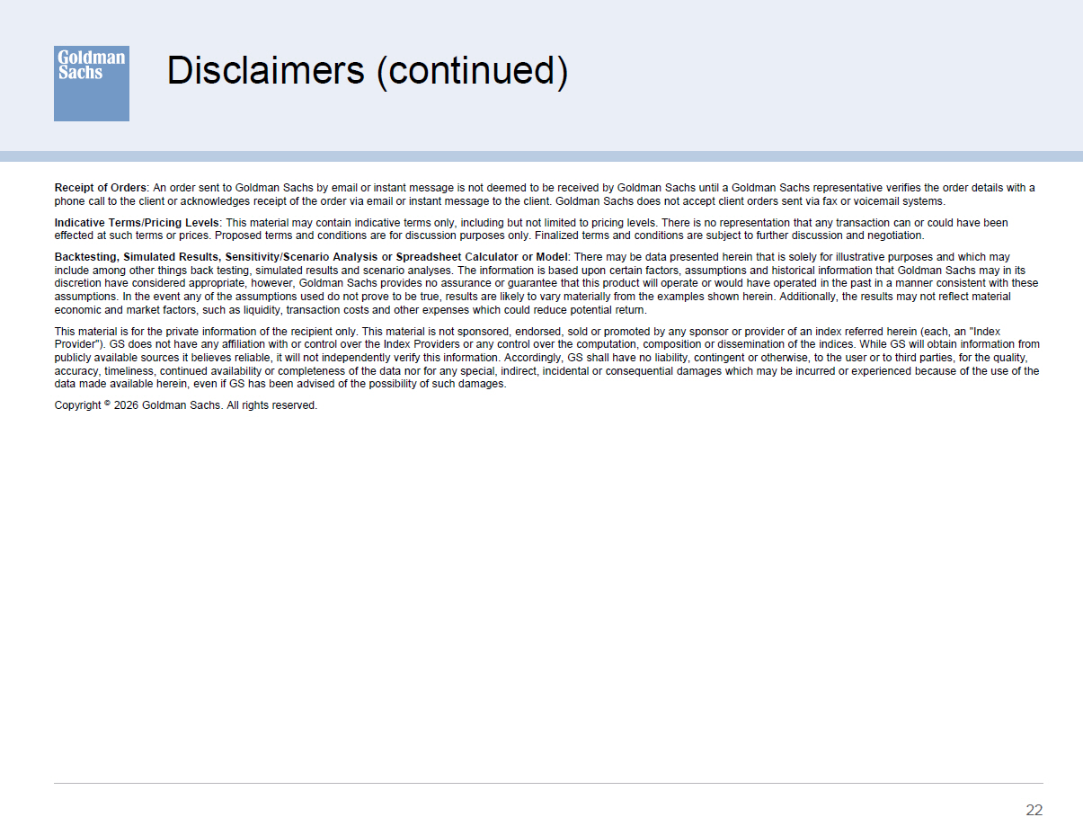 22 Receipt of Orders : An order sent to Goldman Sachs by email or instant message is not deemed to be received by Goldman Sachs until a Goldman Sa chs representative verifies the order details with a phone call to the client or acknowledges receipt of the order via email or instant message to the client. Goldman Sachs does not accept client orders sent via fax or voicemail systems. Indicative Terms/Pricing Levels : This material may contain indicative terms only, including but not limited to pricing levels. There is no representation th at any transaction can or could have been effected at such terms or prices. Proposed terms and conditions are for discussion purposes only. Finalized terms and conditi ons are subject to further discussion and negotiation. Backtesting , Simulated Results, Sensitivity/Scenario Analysis or Spreadsheet Calculator or Model : There may be data presented herein that is solely for illustrative purposes and which may include among other things back testing, simulated results and scenario analyses. The information is based upon certain facto rs, assumptions and historical information that Goldman Sachs may in its discretion have considered appropriate, however, Goldman Sachs provides no assurance or guarantee that this product will oper ate or would have operated in the past in a manner consistent with these assumptions. In the event any of the assumptions used do not prove to be true, results are likely to vary materially from the ex amples shown herein. Additionally, the results may not reflect material economic and market factors, such as liquidity, transaction costs and other expenses which could reduce potential return. This material is for the private information of the recipient only. This material is not sponsored, endorsed, sold or promote d b y any sponsor or provider of an index referred herein (each, an "Index Provider"). GS does not have any affiliation with or control over the Index Providers or any control over the computation, co mpo sition or dissemination of the indices. While GS will obtain information from publicly available sources it believes reliable, it will not independently verify this information. Accordingly, GS shall hav e n o liability, contingent or otherwise, to the user or to third parties, for the quality, accuracy, timeliness, continued availability or completeness of the data nor for any special, indirect, incidental or consequ ent ial damages which may be incurred or experienced because of the use of the data made available herein, even if GS has been advised of the possibility of such damages. Copyright © 2026 Goldman Sachs. All rights reserved. Disclaimers (continued)