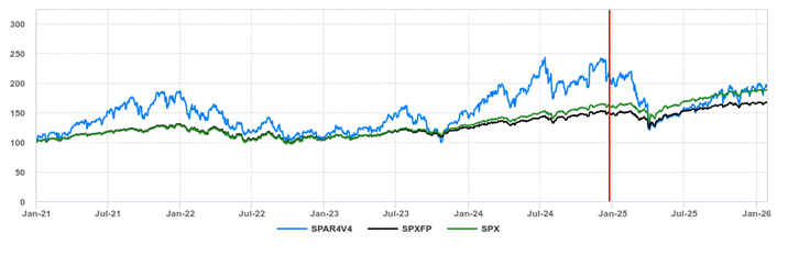 For comparative purposes, the graph below shows the performance, from January 4, 2021 through January 30, 2026, of the S&P 500® Futures 40% VT Adaptive Response 4% Decrement Index (USD) ER, the S&P 500® Futures Excess Return Index and the S&P 500® Index.