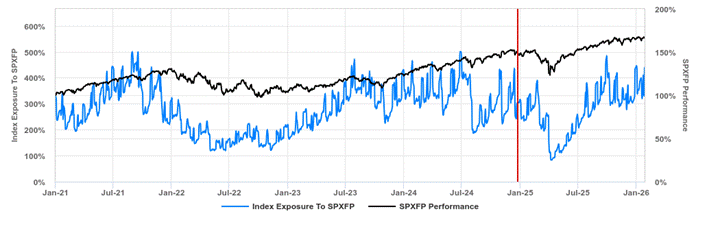The following graph displays the percentage of index exposure to the S&P 500® Futures Excess Return Index and the performance the S&P 500® Futures Excess Return Index during the period from January 4, 2021 through January 30, 2026. The percentage of index exposure to the S&P 500® Futures Excess Return Index on January 30, 2026 is 438.95%. The S&P 500® Futures Excess Return Index has been adjusted to have a closing level of 100.00 on January 4, 2021 by dividing the applicable closing level on each day by such index’s closing level on January 4, 2021 and multiplying the quotient by 100.00.