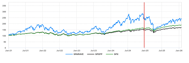 For comparative purposes, the graph below shows the performance, from January 4, 2021 through January 30, 2026, of the S&P 500® Futures 40% VT Adaptive Response Index (USD) ER, the S&P 500® Futures Excess Return Index and the S&P 500® Index.