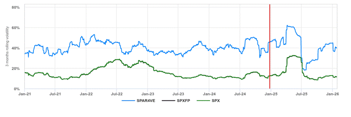 The following graph provides a comparison of the annualized volatility of the S&P 500® Futures 40% VT Adaptive Response Index (USD) ER, the S&P 500® Futures Excess Return Index and the S&P 500® Index from January 4, 2021 through January 30, 2026.