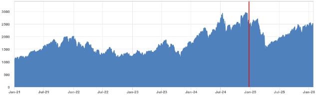 | The graph below shows the daily historical closing levels of the index from January 4, 2021 through January 30, 2026 (historical closing levels appear to the right of the vertical solid line marker), and the following table provides the annualized return and annualized volatility of the index for each applicable period ended January 30, 2026. As a result, this information does not reflect the global financial crisis which began in 2008, which had a materially negative impact on the price of most equity securities and, as a result, the level of most equity indices. |