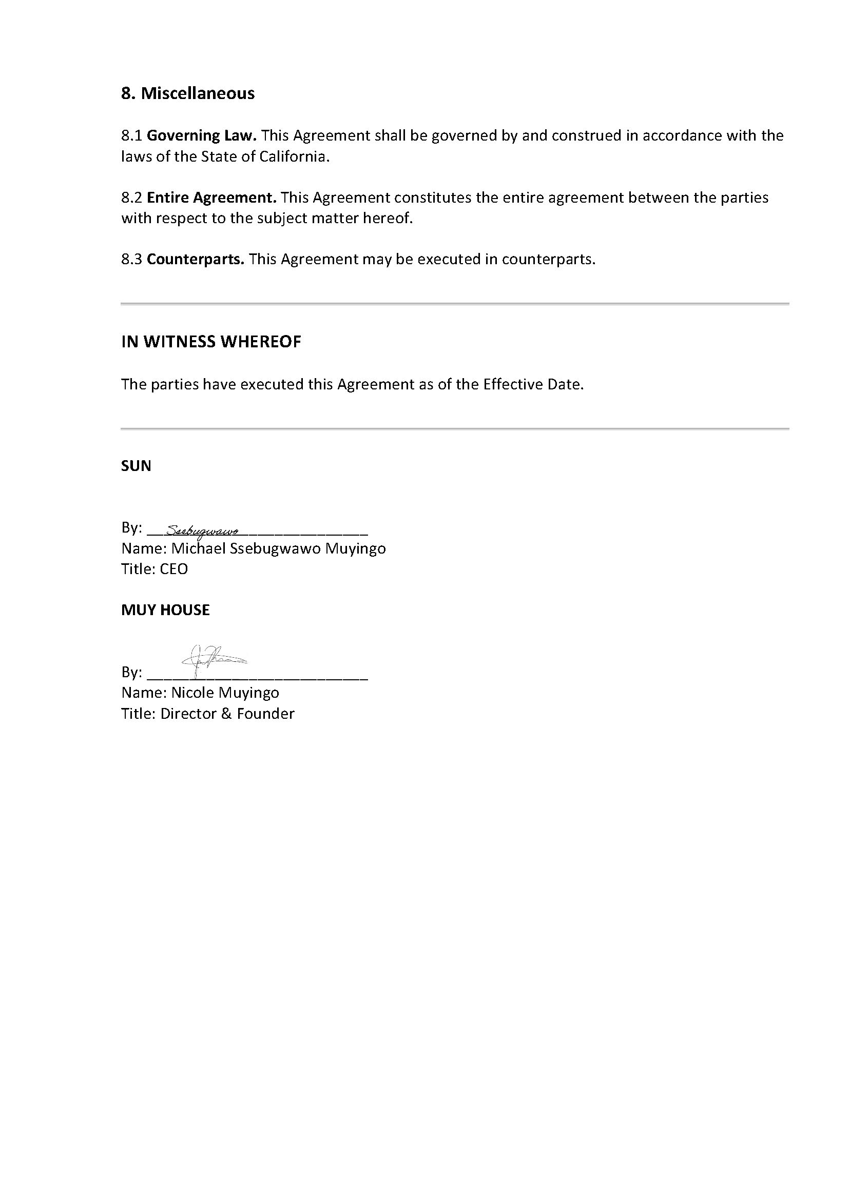 8. Miscellaneous 1. Governing Law. This Agreement shall be governed by and construed in accordance with the laws of the State of California. 2. Entire Agreement. This Agreement constitutes the entire agreement between the parties with respect to the subject matter hereof. 3. Counterparts. This Agreement may be executed in counterparts. IN WITNESS WHEREOF The parties have executed this Agreement as of the Effective Date. SUN By: Name: Michael Ssebugwawo Muyingo Title: CEO MUY HOUSE By: Name: Nicole Muyingo Title: Director & Founder