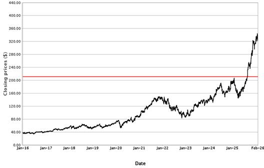 The following graph sets forth historical closing values of the Underlier for the period from January 1, 2016 to February 9, 2026. The red line represents a hypothetical Coupon Threshold and Barrier Value based on the closing value of the Underlier on February 9, 2026. We obtained the information in the graph from Bloomberg Financial Markets, without independent investigation. We cannot give you assurance that the performance of the Underlier will result in the return of all of your initial investment.