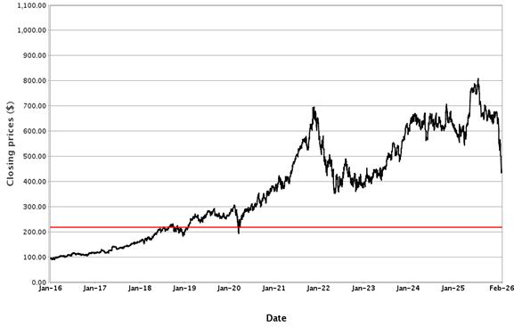 The following graphs set forth historical closing values of the Underliers for the period from January 1, 2016 to February 9, 2026. Each red line represents a hypothetical Coupon Threshold and Barrier Value of the relevant Underlier based on the closing value of the relevant Underlier on February 9, 2026. We obtained the information in the graphs from Bloomberg Financial Markets, without independent investigation. We cannot give you assurance that the performance of the Underliers will result in the return of all of your initial investment.