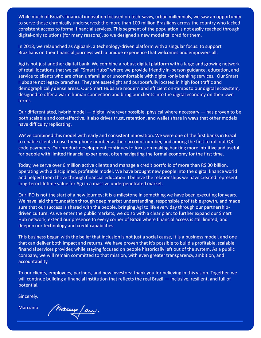 Unless otherwise indicated or the context otherwise requires, all references in this prospectus to “Agibank,” “Agi,” the “Company,” the “Issuer,” “we,” “our,” “ours,” “us” or similar terms refer to (i) prior to the Share Contribution (as defined below), Agi Financial Holding S.A., or Agibank Brazil, and its consolidated subsidiaries, and (ii) following the Share Contribution, AGI Inc, together with its consolidated subsidiaries.