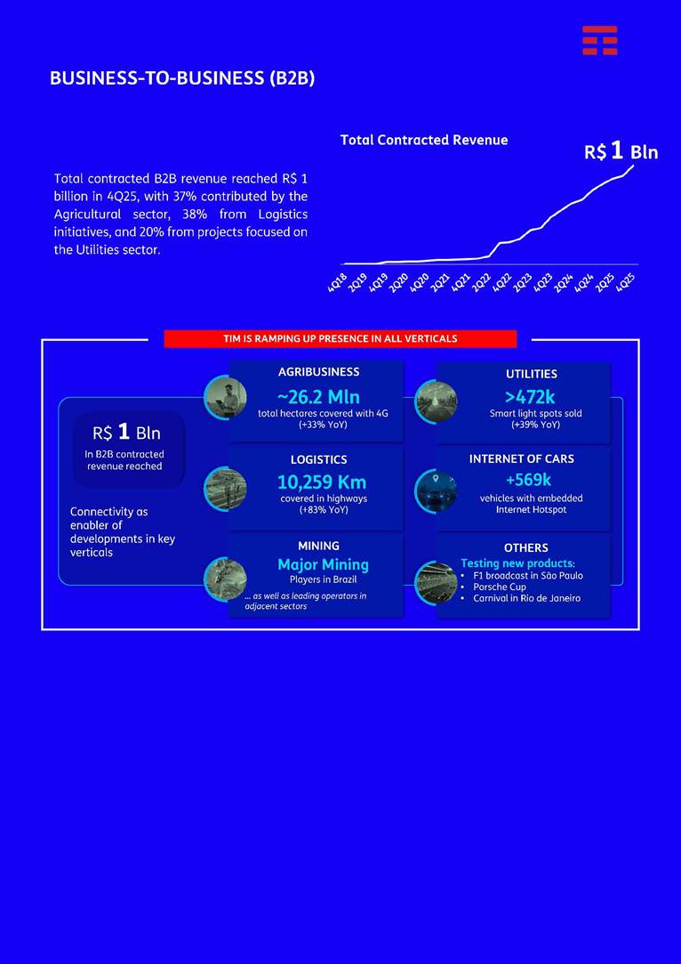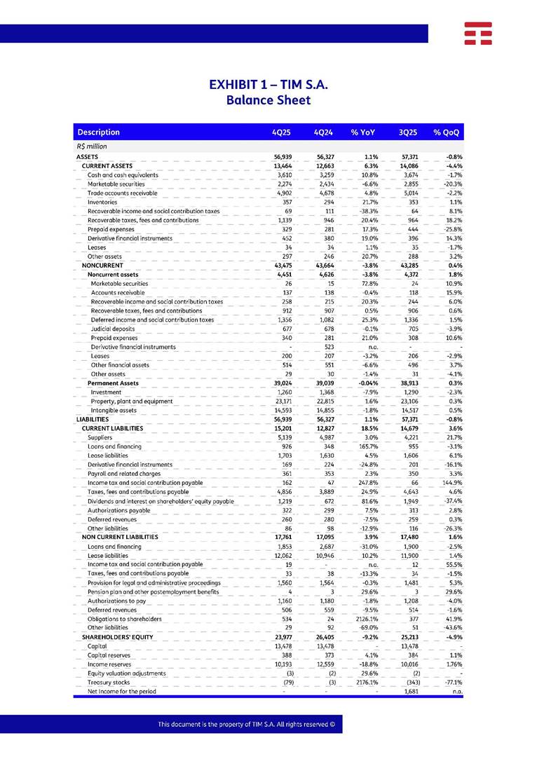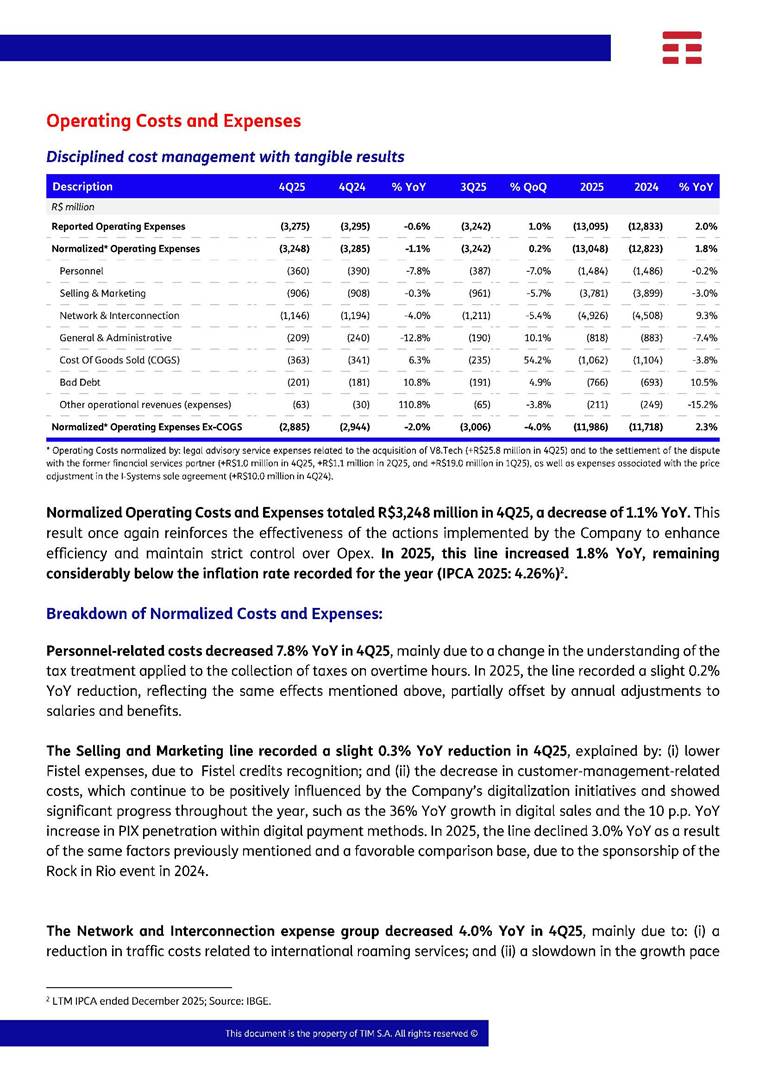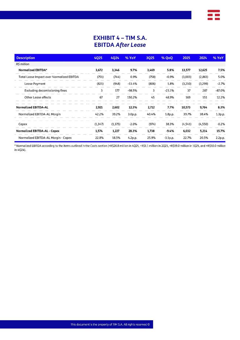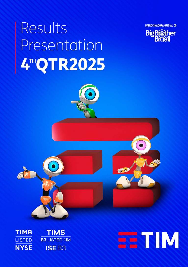 Classificado como Uso Interno Classificado como Uso Interno * EBITDA and Net Income normalized according to the items indicated in their respective sections . EBITDA -AL excluding the impact of site decommissioning fines . Operating Cash Flow (“OpCF ”) represents EBITDA -AL minus Capex . **According to the Opensignal report dated January 28, 2026 (Here ). RESULTS HIGHLIGHTS +27.9% Solid and consistent results drove the achievement of all 2025 targets +9.7% ENDING THE YEAR ON THE RIGHT TRACK Robust EBITDA performance supported margin expansion to the highest record level Another double -digit increase in Net Income brought it to the highest level ever recorded by the Company Normalized * EBITDA and EBITDA Margin (R$ Mln; % YoY ) Normalized * Net Income (R$ Mln; % YoY ) Mobile : Advancing the ‘3 B’s’ strategy, focused on Best Network : enhancing quality and experience ; Best Service: AI to drive caring revolution ; Best Offer : value -driven innovation to support portfolio evolution ; B2B : Accelerate revenues from data monetization initiatives and the adoption of Network as a Service while expanding our portfolio of IoT solutions and Tech offerings ; Broadband : Focus on drive operational improvement to sustain organic growth while maintain optionality to accelerate Broadband as the market evolves ; Efficiency : Consistent discipline combined with strategic capital allocation and expenditure focused on exploring new fronts ; AI: Elevate AI adoption to a transformative level by becoming an AI -First organization . BEST NETWORK: SIX NATIONAL AWARDS IN OPENSIGNAL’S LATEST REPORT 1st Place in Consistent Quality (fourth consecutive time): measures network stability in daily usage 1st Place in Reliability Experience: evaluates the ability to maintain stable connections 1st Place in Video Experience: measures the quality of on -demand streaming 1st Place in Live Video Experience: measures the quality of real -time broadcasts 1st Place in Time on Network: measures the amount of time users remain connected to the network 1st Place in 5G Availability: evaluates users’ actual access to the 5G network +5.2% +11.2% Announced as IoC, Dividends and Buyback through December R$ 4.7 Bln of Capex to Net Revenue in 2025 YoY evolution in Postpaid Revenue in 2025 YoY increase in Mobile Service Revenue in 2025 +5.4% 17.1% YoY growth of Service Revenue in 2025 YoY expansion of OpCF * in 2025 (Margin of 22.7%) +15.7% Expansion of Mobile Service Revenue supported by the strong performance of the Postpaid segment Continuously E nhancing Our Network Quality and Brand Perception Mobile Service Revenue (R$ Mln; % YoY ) +4.8% Solid execution in 2025, with continuous improvements across business verticals and efficiency Ensuring Our Leadership in 5G Coverage o Largest 5G mobile coverage in Brazil, with 1,089 cities served by the country's most awarded 5G network; o Network swap 100% completed in São Paulo and Minas Gerais; o Expansion of the network swap program to modernize 6,500 sites in the largest capitals of the country by 2027. A year of achievements in B2B Coverage Expanding Our Presence Across All Verticals o Achievement of R$ 1 billion in contracted revenue; o More than 26 million hectares covered with 4G (+33% YoY); o Over 10,000 km of roads covered (+83% YoY) and more than 472,000 public lighting points sold (+39% YoY); o Progress in the Mining vertical with contracts signed with the largest mining companies in Brazil; o More than 569,000 vehicles sold with an Internet access point integrated into the TIM network. RESULTS CONFERENCE February 11th, 2026, at : 10:00 a.m. (BRT) / 8:00 a.m. (US EST) Livestream (Zoom): Click here 4Q25 EARNINGS RELEASE Classificado como Uso Interno 4Q25 EARNINGS RELEASE FINANCIAL AND OPERATIONAL HIGHLIGHTS * Normalized EBITDA according to the items outlined in the Costs section (+R $26.8 million in 4Q25, +R$1.1 million in 2Q25, +R$19.0 million in 1Q25, and +R $10.0 million in 4Q24). Normalized Net Income according to the items outlined in the Costs section and by non -recurring effects in Income Tax and Social Contribution (-R$9.1 million in 4Q25, -R$387k in 2Q25, -R$6.5 million in 1Q25, and -R$3.4 million in 4Q24). EBITDA -AL excluding the impact of site decommissioning fines . 4Q25 4Q24 % YoY 3Q25 % QoQ 2025 2024 % YoY FINANCIAL (R$ million) Net Revenues 6,920 6,631 4.4% 6,711 3.1% 26,625 25,448 4.6% Services Revenues 6,665 6,343 5.1% 6,534 2.0% 25,856 24,587 5.2% Mobile Service 6,305 6,015 4.8% 6,203 1.7% 24,519 23,256 5.4% Fixed Service 359 328 9.4% 331 8.6% 1,337 1,331 0.4% Normalized* Operating Expenses (3,248) (3,285) -1.1% (3,242) 0.2% (13,048) (12,823) 1.8% Normalized* EBITDA 3,672 3,346 9.7% 3,469 5.8% 13,577 12,625 7.5% Normalized* EBITDA Margin 53.1% 50.5% 2.6p.p. 51.7% 1.4p.p. 51.0% 49.6% 1.4p.p. Normalized* Net Income 1,349 1,055 27.9% 1,208 11.7% 4,343 3,160 37.4% Capex (1,347) (1,375) -2.0% (974) 38.3% 4,541 4,550 -0.2% Normalized* EBITDA-AL - Capex 1,574 1,227 28.3% 1,738 -9.4% 6,032 5,214 15.7% OPERATIONAL ('000) Mobile Customer Base 61,974 62,058 -0.1% 62,619 -1.0% 61,974 62,058 -0.1% Prepaid 29,226 31,857 -8.3% 30,275 -3.5% 29,226 31,857 -8.3% Postpaid 32,748 30,202 8.4% 32,344 1.2% 32,748 30,202 8.4% TIM Ultrafibra Customer Base 850 790 7.6% 823 3.3% 850 790 7.6% Description RESULTS CONFERENCE February 11th, 2026, at : 10:00 a.m. (BRT) / 8:00 a.m. (US EST) Livestream (Zoom): Click here This document is the property of TIM S.A. All rights reserved © RE CENT AND SUBSEQUENT EVENTS Shareholder Remuneration On December 16, 2025, the Board of Directors of TIM S.A. approved the distribution of Interest on Capital in the amount of R$420 million, in addition to approving the distribution of Dividends totaling R$1,790 million. For further details, please visit TIM S.A.’s Investor Relations website: Filings Cancellation of Treasury Shares On December 16, 2025, TIM S.A. informed the market that the Company’s Board of Directors approved the cancellation 