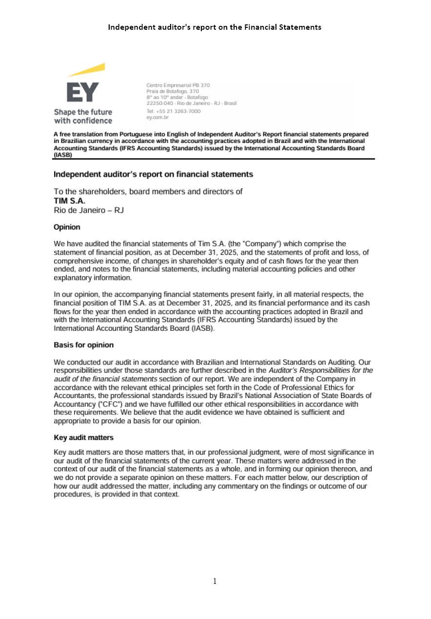 Alberto Mario Griselli (Chief Executive Officer), Andrea Palma Viegas Marques (Chief Financial Officer), Maria Antonietta Russo (People, Culture & Organization Officer), Mario Girasole (Regulatory and Institutional Affairs Officer), Fabiane Reschke (Legal Officer) and Vicente de Moraes Ferreira (Investor Relations Officer), as Statutory Officers of TIM S.A., declare, in accordance with Section 27, paragraph 1, item V of CVM Resolution Nr. 80 of March 29th, 2022, that they have reviewed, discussed and agreed with the opinion expressed on the Company’s Independent Auditors’ Report regarding the Company’s Financial Statements for the year ended December 31th, 2025.