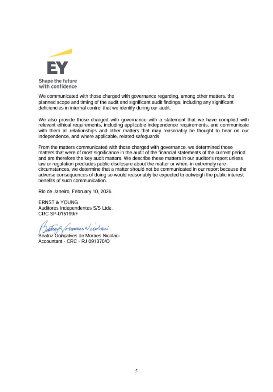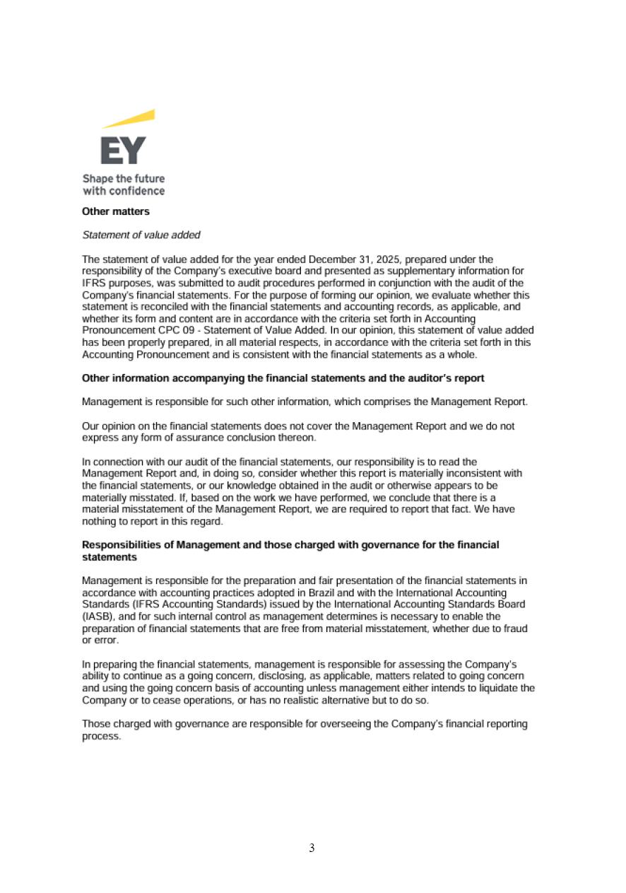 Based on our examinations, the information provided and the clarifications received and, also, considering the Company's Independent Auditors’ Report, Ernst & Young Auditores Independentes S/S (“EY”), unqualified, issued on February 10th, 2026, the Fiscal Council, unanimously, is of the opinion that: (i) the Management’s Report and the Financial Statements above mentioned, adequately reflect the information contained in them; and (ii) the Management’s Proposal for the allocation of results related to the year of 2025 and the distribution of dividends by the Company, are all in conditions to be submitted to the Annual General Shareholders Meeting.