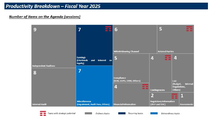 The matters addressed throughout the CAE’s annual program were classified as follows: (i) ordinary matters (arising from legislation, applicable regulations, and internal policies); (ii) recurring matters (arising from the annual work plan); and (iii) extraordinary matters (not included in the previous items and submitted at the request of the Company’s management or the CAE members themselves).