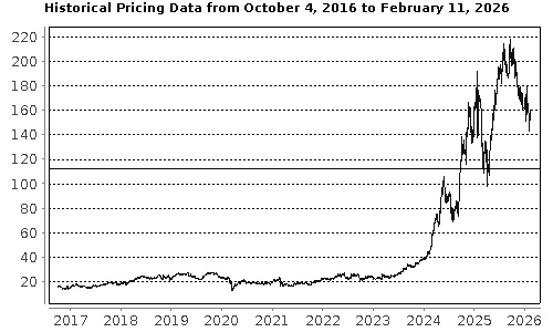 The graph below illustrates the performance of Vistra's common stock for the period indicated, based on the daily closing levels as reported by Bloomberg, without independent verification. UBS has not conducted any independent review or due diligence of any publicly available information obtained from Bloomberg. The solid line represents its coupon barrier and downside threshold of $112.11, which is equal to 70.00% of the closing level on February 11, 2026. Past performance of the underlying asset is not indicative of the future performance of the underlying asset during the term of the Notes. |