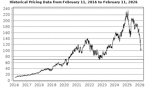 The graph below illustrates the performance of ServiceNow's common stock for the period indicated, based on the daily closing levels as reported by Bloomberg, without independent verification. UBS has not conducted any independent review or due diligence of any publicly available information obtained from Bloomberg. The solid line represents its coupon barrier and downside threshold of $70.41, which is equal to 70.00% of the closing level on February 11, 2026. Past performance of the underlying asset is not indicative of the future performance of the underlying asset during the term of the Notes. |