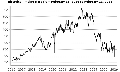 The graph below illustrates the performance of Humana's common stock for the period indicated, based on the daily closing levels as reported by Bloomberg, without independent verification. UBS has not conducted any independent review or due diligence of any publicly available information obtained from Bloomberg. The solid line represents its coupon barrier and downside threshold of $122.78, which is equal to 70.00% of the closing level on February 11, 2026. Past performance of the underlying asset is not indicative of the future performance of the underlying asset during the term of the Notes. |