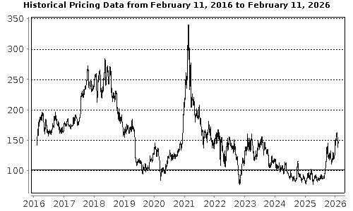 The graph below illustrates the performance of Baidu's ADRs for the period indicated, based on the daily closing levels as reported by Bloomberg, without independent verification. UBS has not conducted any independent review or due diligence of any publicly available information obtained from Bloomberg. The solid line represents its coupon barrier and downside threshold of $101.58, which is equal to 70.00% of the closing level on February 11, 2026. Past performance of the underlying asset is not indicative of the future performance of the underlying asset during the term of the Notes. |